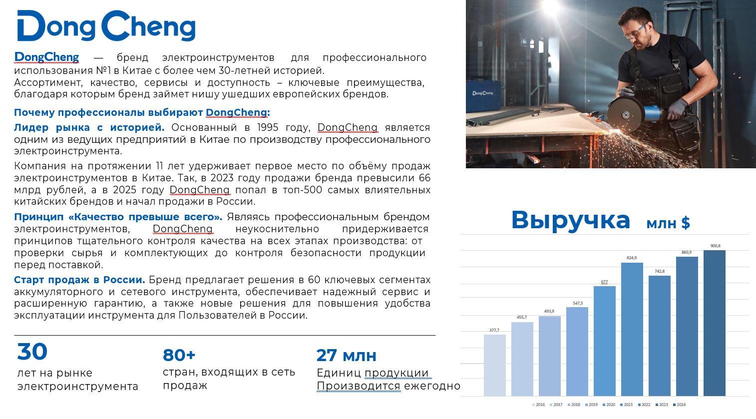 Компания на протяжении 11 лет удерживает первое место по объёму продаж электроинструментов в Китае. Так, в 2023 году продажи бренда превысили 66 млрд рублей, а в 2025 году DongCheng попал в топ-500 самых влиятельных китайских брендов и начал продажи в России.