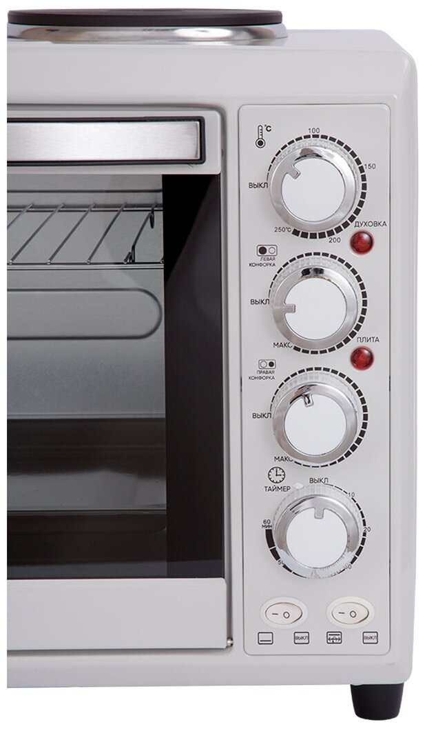 Описание Мини-печь ECON ECO-GP3821MO Мини-печь Econ ECO-GP3821MO – альтернатива традиционной кухонной плите. Её возможностей достаточно, чтобы вы могли приготовить и повседневную еду, и угощение на праздничный стол. В вашем распоряжении – две конфорки. Также есть мини-духовка, объём которой составляет 32 л. Она работает в шести режимах, среди которых – гриль, позволяющий зажаривать мясо и рыбу до появления красивой румяной корочки. Система управления – механическая. Мощность и другие важные параметры настраиваются с помощью поворотных переключателей, удобно расположенных на фронтальной панели. В нижней части корпуса есть прорезиненные ножки, препятствующие скольжению и обеспечивающие хорошую устойчивость. Внутренние стенки сделаны из оцинкованной стали. Они не боятся коррозии, а при необходимости вы легко очистите их от жира и других загрязнений.