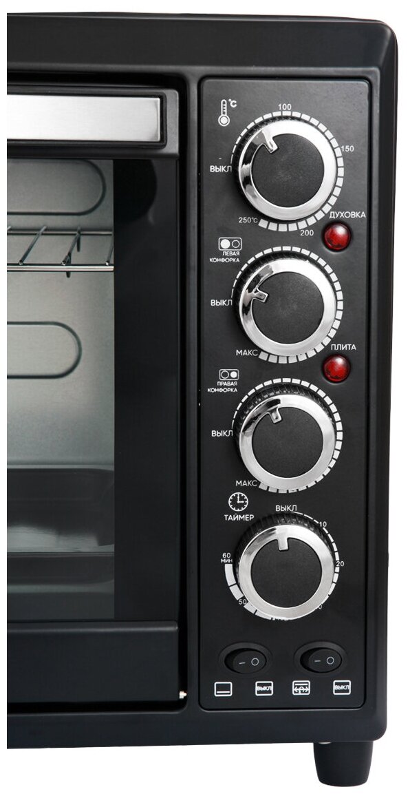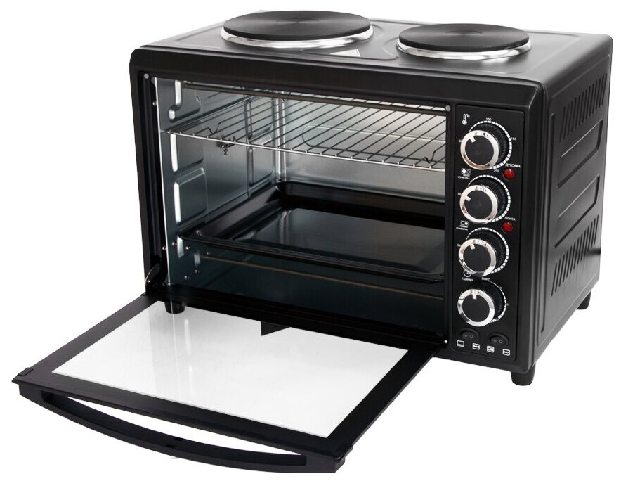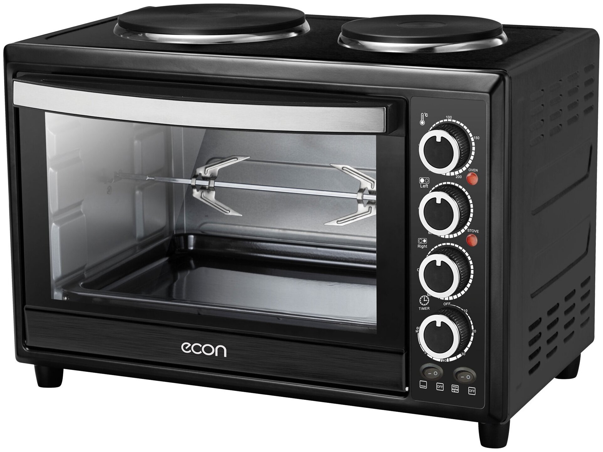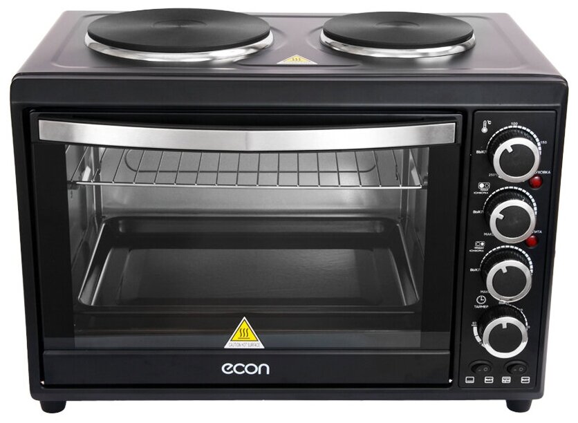 Описание Мини-печь ECON ECO-GP3822MO Мини-печь ECON ECO-GP3822MO — настоящий кулинарный центр, который заменит собой встраиваемую духовку и настольную плитку. Благодаря внушительному объему в ней можно приготовить до шести порций блюда или запечь целую тушку курицу. Для последней предусмотрен вращающийся электромеханический вертел, помогающий равномерно прожаривать мясо со всех сторон. Пользуясь мини-печью ECON ECO-GP3822MO, вы легко получите аппетитное блюдо с хрустящей золотистой корочкой. Для этого вам достаточно включить мощный гриль, запекающий продукты с помощью инфракрасных лучей. Печь также позволяет включать верхний и нижний нагреватель одновременно, чтобы получить идеальный результат. На верхней панели мини-печи ECON ECO-GP3822MO установлены чугунные конфорки диаметром 15,5 и 18,8 сантиметров, совместимые как с маленькими кастрюльками, так и с большими сковородами. Вместе с устройством вы получаете набор аксессуаров: плоский противень со съемной ручкой, вращающийся вертел с держателями для курицы и хромированную решетку.