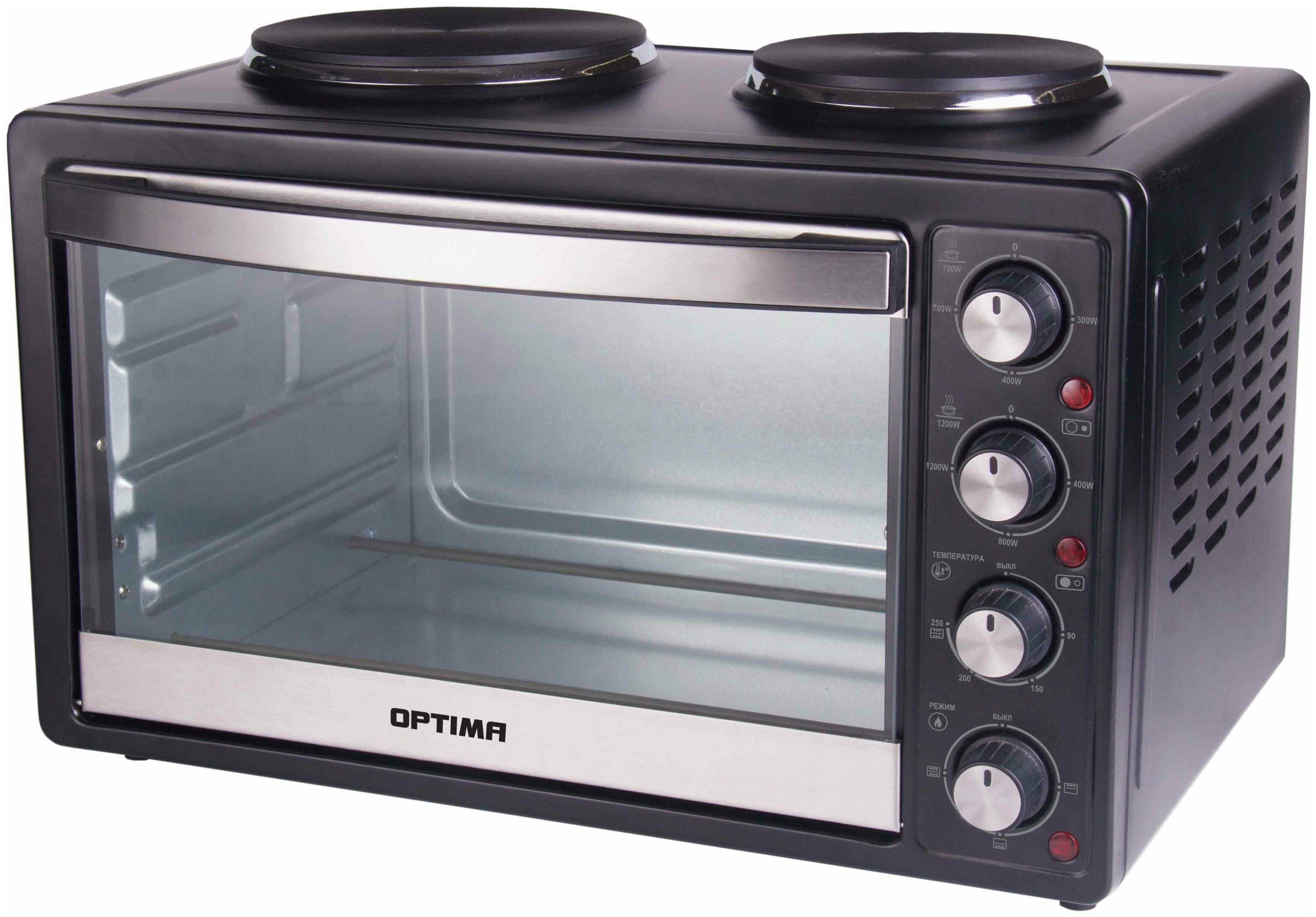 Описание Мини-печь OPTIMA OH-352MB Black Электропечь OPTIMA OH-352MB в стильном черном корпусе привлекает функциональностью. Такой бытовой прибор станет полезным дополнением для кухонного интерьера. Вместительность устройства приравнивается к 33 л, а благодаря мощности 3300 Вт данное пространство быстро разогревается до максимальной температуры. Удобное механическое управление в виде вертящихся ручек позволяет регулировать температуру и время приготовления. OPTIMA OH-352MB оснащена двумя дополнительными конфорками, что удобно. Такая электропечь с легкостью войдет в малогабаритную кухню. Корпус из нержавеющей стали можно многократно мыть, от чего его внешний вид не изменится.