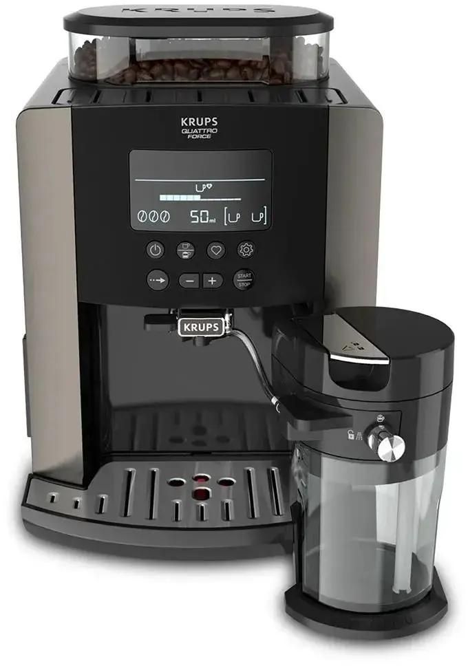 Описание Кофемашина Krups Arabica Latte EA819E10 Откройте для себя мир изысканных кофейных напитков с автоматической кофемашиной KRUPS Arabica! Эта стильная и функциональная машина станет вашим верным спутником в создании потрясающе вкусного и ароматного кофе прямо у вас дома. С большим и удобным LCD-дисплеем вы сможете легко и быстро приготовить эспрессо или капучино одним нажатием кнопки. Три предустановленные программы для молочных напитков позволят вам наслаждаться воздушной и кремовой молочной пеной, идеально соответствующей вашему вкусу. А благодаря интеллектуальной системе, вы сможете сохранить до четырех любимых рецептов, чтобы каждый раз радовать себя и близких любимыми напитками. KRUPS Arabica не только радует своим функционалом, но и простотой в уходе: съемный резервуар для воды и капучинатор, который легко разбирается на три части, делают процесс очистки быстрым и удобным. Инновационная технология KRUPS Quattro Force гарантирует потрясающий вкус и аромат в каждой чашке кофе, позволяя вам наслаждаться настоящим кофейным искусством. Подарите себе удовольствие от идеального кофе с KRUPS Arabica — ваш домашний бариста всегда готов к работе