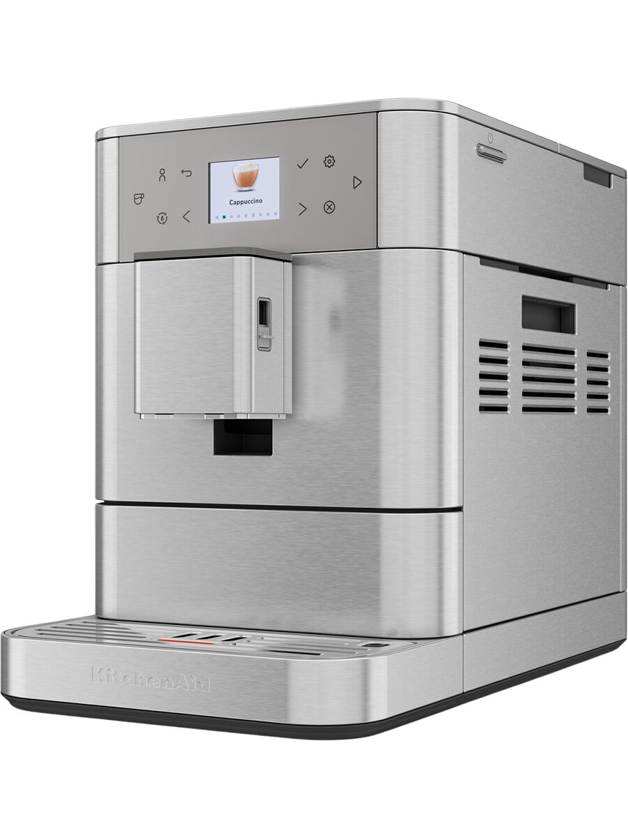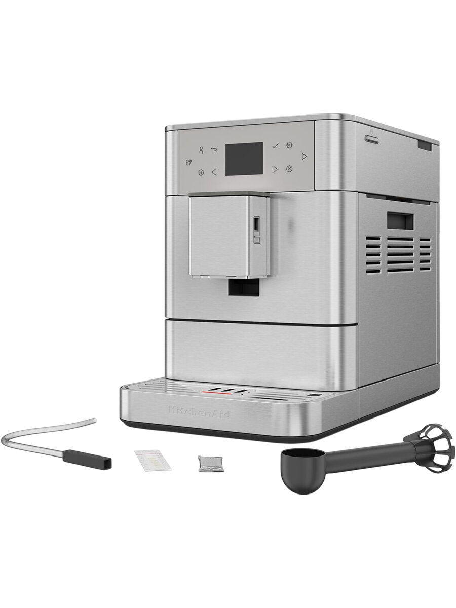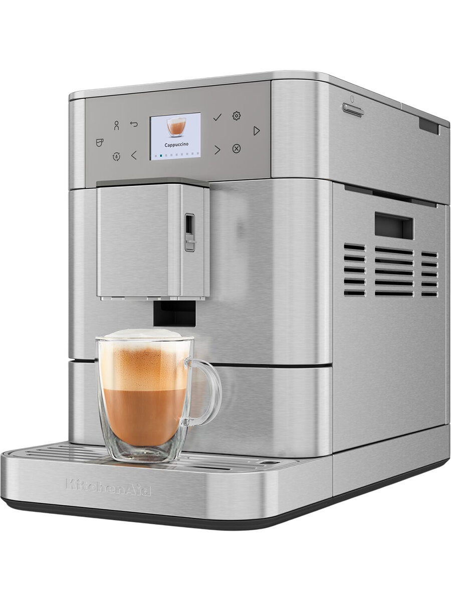 Описание Кофемашина KitchenAid 5KES8556ESX Автоматическая эспрессо-машина KitchenAid 5KES8556ESX — это высококачественный прибор, разработанный для ценителей кофе, желающих наслаждаться любимыми напитками у себя дома. Благодаря прочной металлической конструкции, она обеспечивает долговечность и стабильность в работе. Основные особенности: Уведомления о необходимости очистки: Машина оснащена функцией оповещения о необходимости проведения очередного цикла очистки, включая декальцинацию, что помогает поддерживать её в идеальном состоянии и обеспечивает оптимальную производительность. Технология быстрого нагрева термоблока: Благодаря этой технологии, вода быстро достигает идеальной температуры и поддерживает её на протяжении всего процесса приготовления, позволяя готовить вкусные эспрессо за короткое время. Сертификация Quiet Mark: Машина сертифицирована как одна из самых тихих в своём классе, что позволяет наслаждаться утренним кофе без лишнего шума. Простота в использовании: С помощью цветного дисплея можно выбрать из 15 предустановленных рецептов, таких как эспрессо, американо, капучино и другие. Пользователь может настроить крепость, температуру, порядок добавления молока или кофе, а также количество ингредиентов. Есть возможность сохранить настройки для четырёх пользователей, что обеспечивает быстрый доступ к любимым напиткам всей семьи. Съёмный контейнер для зёрен: Легко заменяемый контейнер позволяет пробовать различные сорта кофе, а встроенная кофемолка автоматически дозирует необходимое количество для каждой порции. Функция автоматической очистки предотвращает смешивание остатков разных сортов, сохраняя чистоту вкуса. Автоматическое вспенивание молока: Машина автоматически вспенивает или подогревает необходимое количество молока для приготовления идеального капучино или латте. Достаточно поместить трубку в контейнер с молоком, и прибор добавит его в напиток по выбранному рецепту.