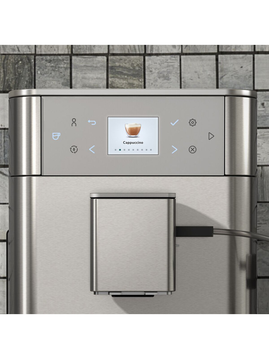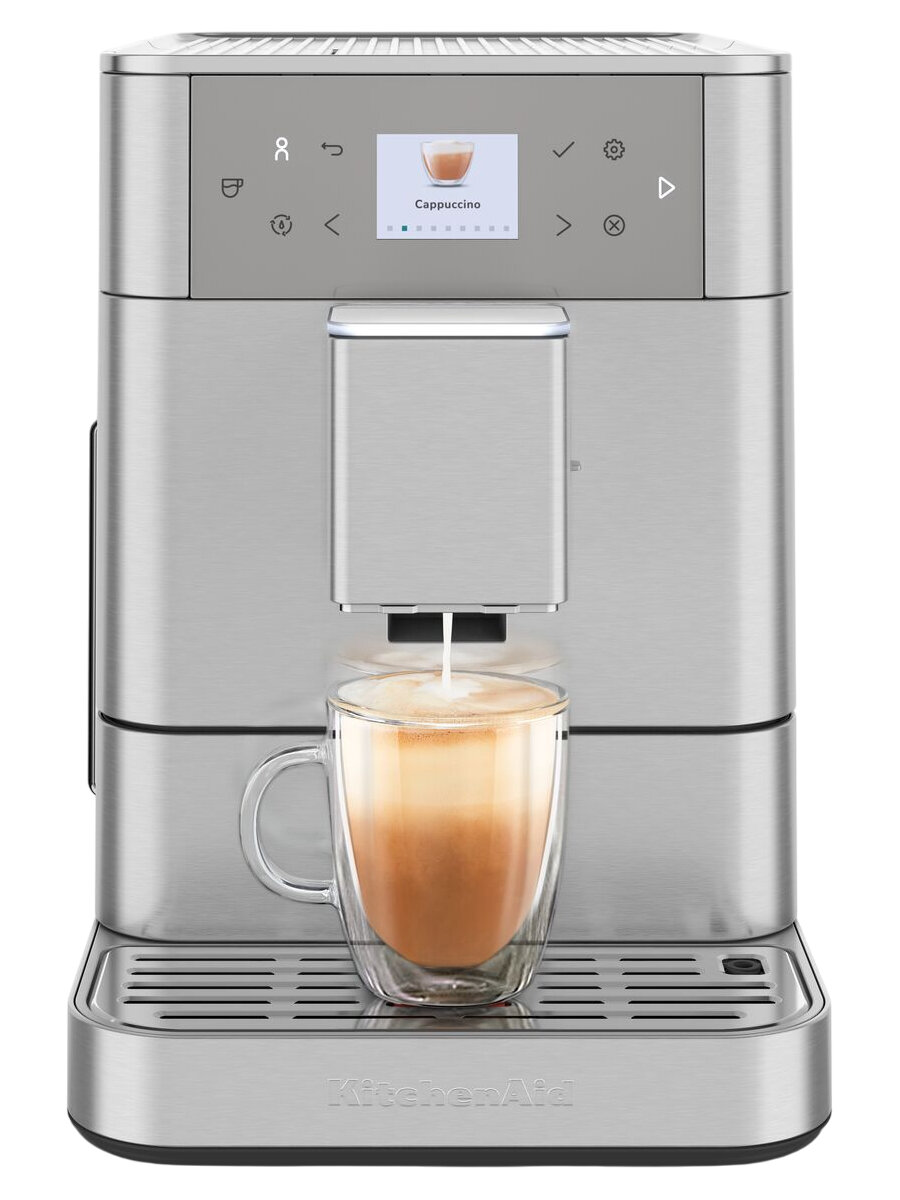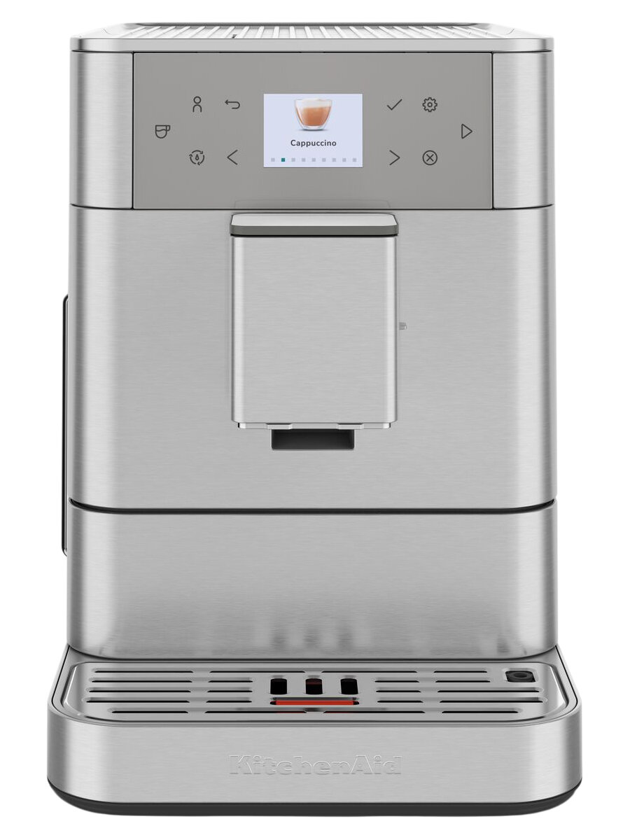 Описание Кофемашина KitchenAid 5KES8556ESX Автоматическая эспрессо-машина KitchenAid 5KES8556ESX — это высококачественный прибор, разработанный для ценителей кофе, желающих наслаждаться любимыми напитками у себя дома. Благодаря прочной металлической конструкции, она обеспечивает долговечность и стабильность в работе. Основные особенности: Уведомления о необходимости очистки: Машина оснащена функцией оповещения о необходимости проведения очередного цикла очистки, включая декальцинацию, что помогает поддерживать её в идеальном состоянии и обеспечивает оптимальную производительность. Технология быстрого нагрева термоблока: Благодаря этой технологии, вода быстро достигает идеальной температуры и поддерживает её на протяжении всего процесса приготовления, позволяя готовить вкусные эспрессо за короткое время. Сертификация Quiet Mark: Машина сертифицирована как одна из самых тихих в своём классе, что позволяет наслаждаться утренним кофе без лишнего шума. Простота в использовании: С помощью цветного дисплея можно выбрать из 15 предустановленных рецептов, таких как эспрессо, американо, капучино и другие. Пользователь может настроить крепость, температуру, порядок добавления молока или кофе, а также количество ингредиентов. Есть возможность сохранить настройки для четырёх пользователей, что обеспечивает быстрый доступ к любимым напиткам всей семьи. Съёмный контейнер для зёрен: Легко заменяемый контейнер позволяет пробовать различные сорта кофе, а встроенная кофемолка автоматически дозирует необходимое количество для каждой порции. Функция автоматической очистки предотвращает смешивание остатков разных сортов, сохраняя чистоту вкуса. Автоматическое вспенивание молока: Машина автоматически вспенивает или подогревает необходимое количество молока для приготовления идеального капучино или латте. Достаточно поместить трубку в контейнер с молоком, и прибор добавит его в напиток по выбранному рецепту.