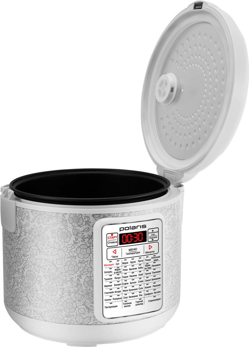 Описание Мультиварка Polaris PMC 0577D Особенности Модель имеет систему равномерного нагрева, которая обеспечивает эффективное приготовление любых блюд. Имеется 5-литровая чаша с антипригарным покрытием. Чаша Внутри корпуса, сделанного из прочного пластика, находится 5-литровая чаша с антипригарным покрытием, которую можно мыть в посудомоечной машине. Для удобства эксплуатации чаша оснащена эргономичными ручками. К корпусу подсоединяется съемный сетевой шнур, для хранения которого предусмотрен специальный отсек. Программы 65 автоматических программ дают возможность готовить самые разные блюда, включая супы и бульоны, рагу и запеканки, стейки и паровые котлеты, рассыпчатые гарниры и молочные каши, бобы, пасту и многое другое. Управление Для управления мультиваркой используется интуитивно понятная панель управления с дисплеем, на котором отображается вся необходимая информация. Мой рецепт PLUS Данная функция предназначена для последовательного внесения изменений в показатели температуры и времени на каждом из этапов готовки. Всего предусмотрено 3 этапа в одном цикле готовки. Программа «Мой рецепт PLUS» может использоваться вместе с функцией отложенного старта. Дополнительные функции Мультиварка имеет таймер отсрочки, с помощью которого вы сможете установить нужное вам время запуска устройства. Продолжительность отсрочки может достигать 24 ч. Кроме того, полезным будет режим поддержания температуры.