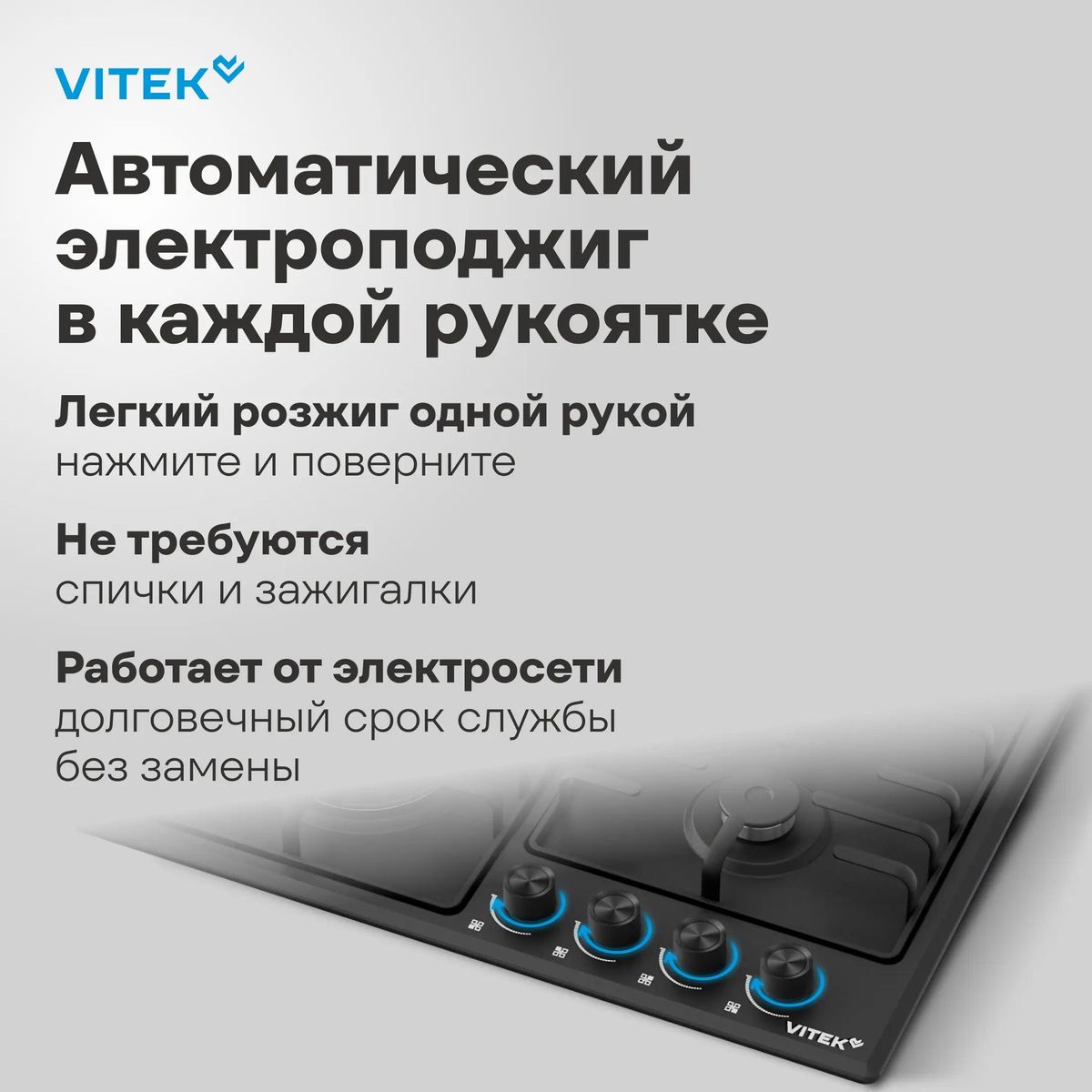 Описание Варочная панель газовая Vitek VGH 6410W MBK Газовая варочная поверхность Vitek VGH 6410W MBK — практичность и элегантность! Встраиваемая варочная панель выполнена в стильном дизайне и будет великолепным дополнением для любой кухни. Черный цвет обеспечивает не только привлекательный внешний вид, но и легкость в уходе. Прочные решетки отличаются долговечностью и устойчивостью к высоким температурам. Механическое управление представлено в виде поворотных переключателей и добавляет удобства в работу с кухонной техникой. Конструкция устройства предусматривает 4 рабочих зоны. Система газ - контроля гарантирует безопасность использования: в случае затухания пламени подача газа автоматически прекращается. Для максимального комфорта, бытовая техника оснащена электроподжигом. Готовьте с удовольствием вместе с Vitek!