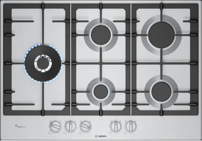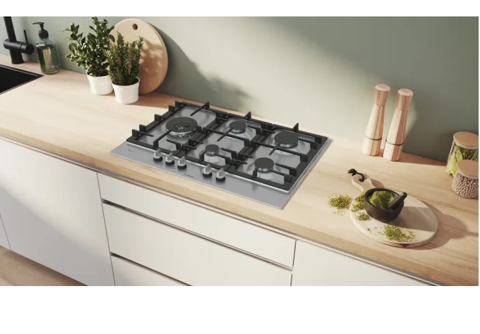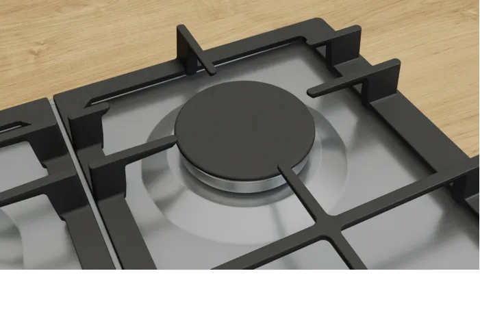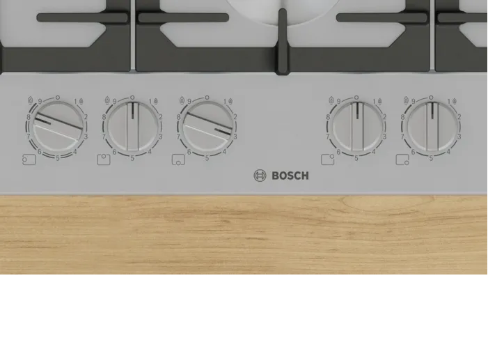 Описание Варочная панель газовая Bosch PCS7A5I90 Газовая варочная панель Bosch PCS7A5I90 имеет пять конфорок с разноуровневой мощностью, суммарная мощность которых достигает 12.5 кВт: левая зона с WOK-конфоркой мощностью 5 кВт обеспечивает интенсивный нагрев для больших сковород и литых посуд, задняя правая — 3 кВт, передние и задние боковые зоны — от 1 до 1.75 кВт, что даёт широкий диапазон регулировок и позволяет одновременно готовить разнообразные блюда. Пять зон сочетаются с девятью ступенями мощности, благодаря чему можно точно подбирать интенсивность нагрева для тушения, кипячения, жарки и медленного томления. Такая конфигурация пригодится при готовке больших трапез и при необходимости одновременно использовать несколько ёмкостей различных объёмов. Практичность подчёркивается чугунными решётками, которые отличаются устойчивостью к нагрузкам и высокой термостойкостью, обеспечивая надёжную опору для тяжёлой посуды. Чугунная структура также равномерно распределяет вес, что делает эксплуатацию более комфортной. Материал рабочей поверхности — нержавеющая сталь — прост в уходе, устойчив к механическим воздействиям и сохраняет эстетический вид при регулярном использовании; это выгодный выбор для тех, кто ценит сочетание практичности и презентабельности. Управление реализовано посредством поворотных ручек, интуитивно понятных и удобных в обращении: поворотная схема позволяет быстро изменять уровень пламени и фиксировать выбранную позицию. Наличие автоматического электроподжига упрощает запуск конфорок — зажигание происходит непосредственно с поворотом ручки, что экономит время и исключает необходимость использования дополнительных устройств. Система газ-контроля с термоэлектрической защитой повышает безопасность эксплуатации, реагируя на затухание пламени и предотвращая утечки газа, соответствуя ожиданиям пользователей, которые уделяют внимание защитным механизмам. Ключевые преимущества: Нержавеющая сталь Автоподжиг Газ-контроль