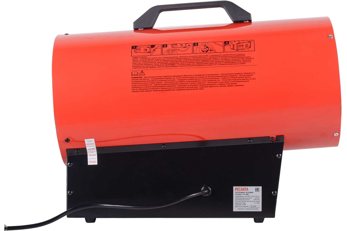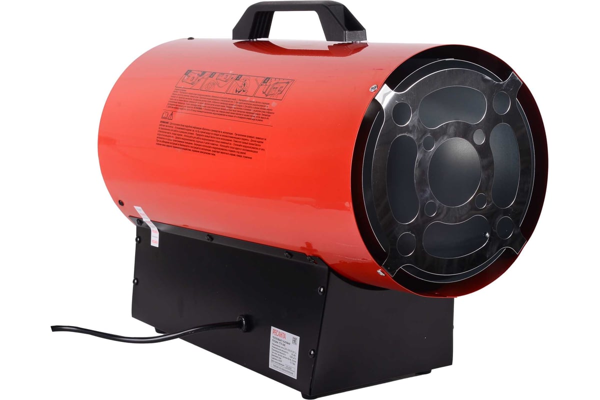 Описание Тепловая пушка Ресанта ТГП-30E [67/1/81] Тепловая газовая пушка Ресанта ТГП-30E - это воздухонагреватель, работающий на сжиженном газовом топливе. Топливо необходимо для получения горячей атмосферы в камере сгорания, а электроэнергия, подводимая к устройству, необходима для питания вентилятора, нагнетающего воздух, и для функционирования автоматики. Мощность обогрева составляет 30.0 кВт, что позволяет быстро и эффективно обогревать помещения. Пушка оснащена термостатом, который автоматически поддерживает заданную температуру. Это обеспечивает комфорт и безопасность использования, предотвращая перегрев устройства. Системы защиты пушки включают отключение при перегреве, что обеспечивает безопасность использования и продлевает срок службы устройства. Максимальный воздухообмен составляет 1000.0 м³/ч, что позволяет быстро и равномерно обогревать большие помещения. Напряжение пушки составляет 220/230 В, что делает ее подходящей для использования в бытовых и коммерческих условиях. Пушка выполнена в красном и черном цветах, что придает ей стильный и современный вид. Подробная комплектация включает в себя тепловую пушку серии ТГП, ручку, газовый шланг, регулятор давления и паспорт. Тип газа, на котором работает пушка, - пропан, пропан-бутан или бутан. Давление газа составляет 0,7 бар, а зажигание осуществляется с помощью пьезоэлектрического элемента. Основной контроль пламени осуществляется с помощью биметаллического термодатчика. Прочие характеристики включают цифровой термостат и отсутствие протокола связи Умного дома. Выбирая тепловую газовую пушку Ресанта ТГП-30E, вы получаете надежный и эффективный инструмент для быстрого и равномерного обогрева помещений.