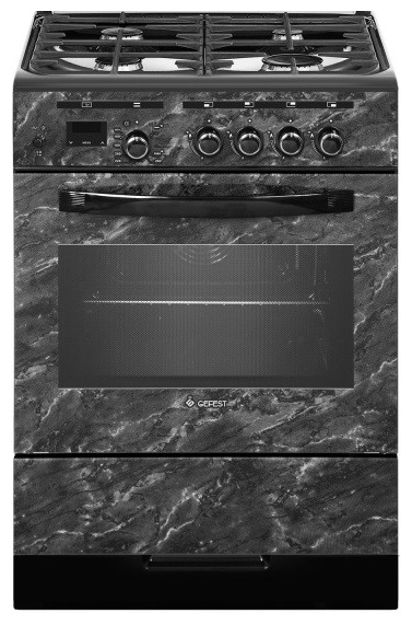 Описание Газовая плита Gefest ПГ 6300-03 0053 Газовая плита Gefest ПГ 6300-03 0053 черного цвета с нанесенной тектурой мрамора, фасад декорирован панелями из стекла. Модель поставляется со стеклянной крышкой рабочего стола и выдвижным ящиком для хранения. Все конфорки варочной поверхности оборудованы газ-контролем и электроподжигом (автоматический, встроен в ручки управления). Комплектуется чугунными решетками, составными. Духовка плиты Gefest ПГ 6300-03 0053 оборудована нижней горелкой и верхним нагревательным элементом (газовый гриль, включается отдельным режимом), оснащены электроподжигом и газ-контролем. Направляющие для противней выполнены съемными для легкого доступа и уборки, для запекания больших кусков мяса есть съемный вертел. Для отслеживания готовности блюда в жарочном шкафе установлено внутреннее освещение. О необходимости подойти к плите напомнит сенсорный таймер, подающий звуковой сигнал. Ключевые преимущества:
