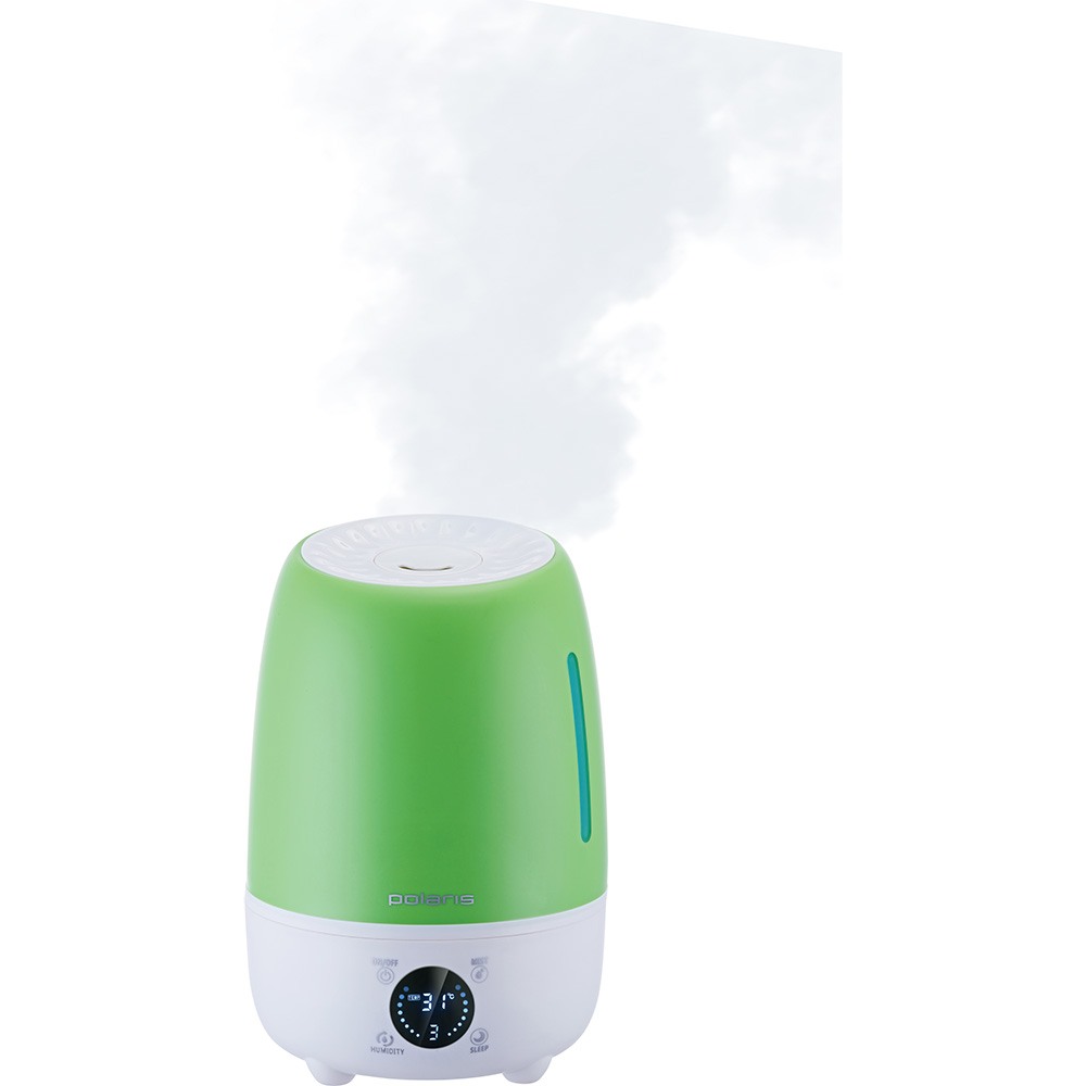 Описание Увлажнитель воздуха Polaris PUH 6805Di Увлажнитель воздуха Polaris PUH 6805Di зеленого цвета отлично впишется в эко-дизайн или в интерьер с подобными элементами. Простота использования Чтобы наполнить бак водой, нужно снять его с основания. Для включения/выключения и установки режима работы служит сенсорная панель управления с 4 кнопками. Все данные о заданных параметрах и о влажности в комнате отражаются на круглом дисплее. Режимы работы У прибора есть 3 варианта скорости подачи пара, что позволяет ему эффективно работать в различных условиях. Кроме того, есть ночной режим с бесшумной работой. Ионизация воздуха Прибор оснащен функцией ионизации – при включенной функции воздух обеззараживается, насыщается отрицательно заряженными ионами, становится легким для дыхания. Технические характеристики увлажнителя воздуха Polaris PUH 6805Di Использовать данную модель рекомендуется в комнате площадью до 40 кв.м. Бак для воды достаточно вместительный (5л), чтобы обеспечить работу до 30 часов без перерыва. Прибор экономичен в плане энергопотребления – мощность составляет 25Вт. Отключение прибора Если в баке закончится вода, произойдет автоматическое отключение работы увлажнителя. Очистка воды Заливать воду в бак можно из крана. Керамический фильтр очищает ее от примесей и смягчает, тем самым уберегая внутренние детали от образования налета.