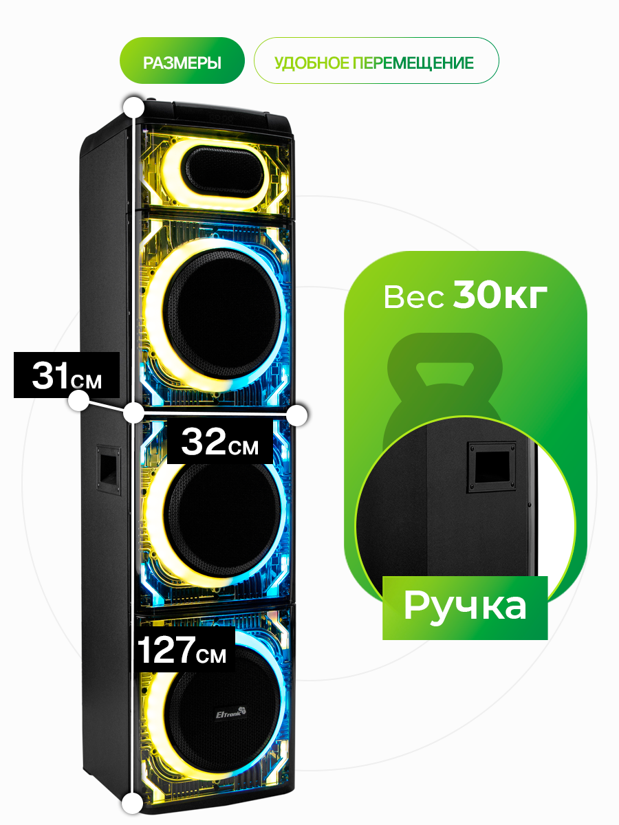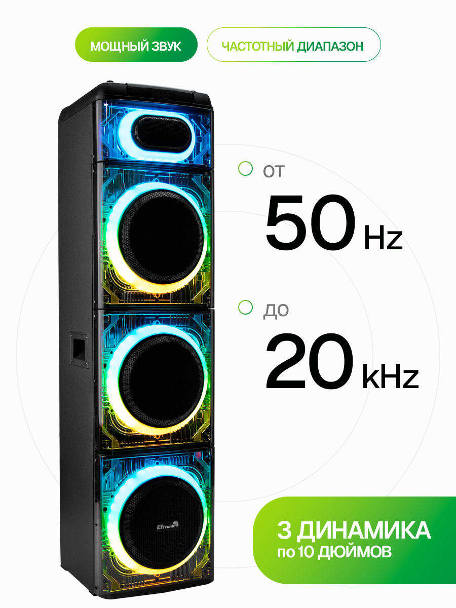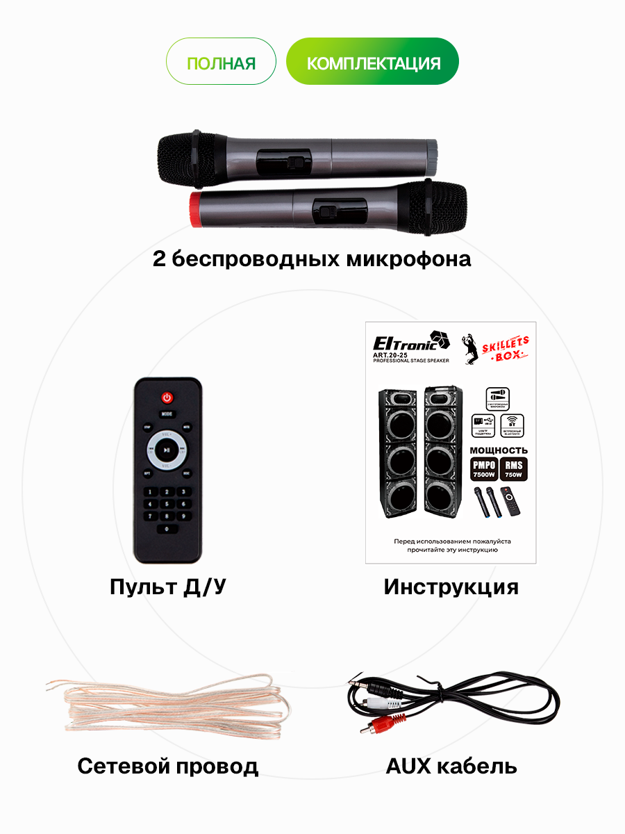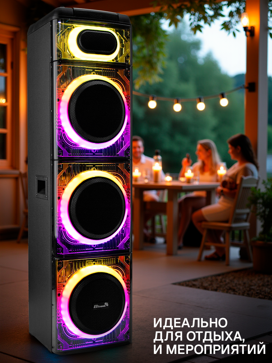 Описание Акустическая система Eltronic 20-26 Skillets Box 3500 ElTRONIC 20-26 SKILLETS BOX - это акустическая колонка, которая обеспечивает мощное и качественное звучание благодаря трем 10-дюймовым динамикам. Устройство поддерживает различные режимы воспроизведения: Bluetooth, внешний накопитель, Aux и FM. Это позволяет легко подключить колонку к различным устройствам и наслаждаться музыкой без проводов. Мощность колонки составляет 3500 Ватт PMPO и 350 Ватт RMS, что гарантирует громкий и чистый звук. Частотный диапазон колонки - от 50Hz до 20KHz, а сигнал/шум - 86dB. Питание колонки осуществляется от сети 220V. Устройство оснащено различными разъемами: USB, MicroSD, SD, Jack 6.3 мм для микрофона и гитары. Это позволяет подключать к колонке различные устройства и носители информации. В комплекте с колонкой идут беспроводной микрофон (2 шт), пульт, кабель AUX и инструкция. Дополнительно колонка оснащена TWS функцией, которая позволяет соединять две колонки в акустическую систему через Bluetooth. Также есть дисплей, регулировка звучания микрофонов, LED подсветка динамика и шести полосный эквалайзер. Размеры упаковки составляют 38 см в ширину, 134 см в высоту и 38 см в глубину, а вес нетто - 30 кг. ElTRONIC 20-26 SKILLETS BOX - это мощная, функциональная и стильная акустическая колонка, которая станет отличным выбором для любителей качественного звука.