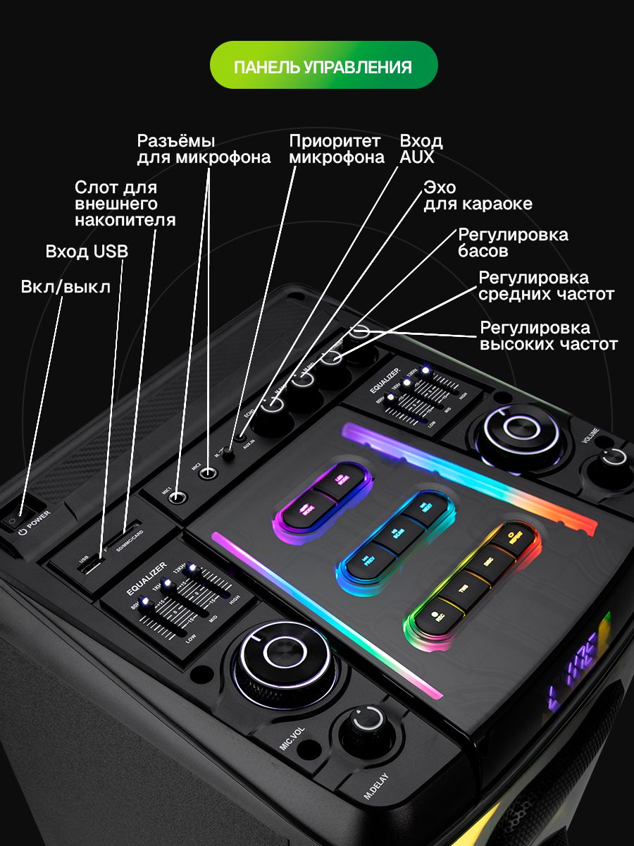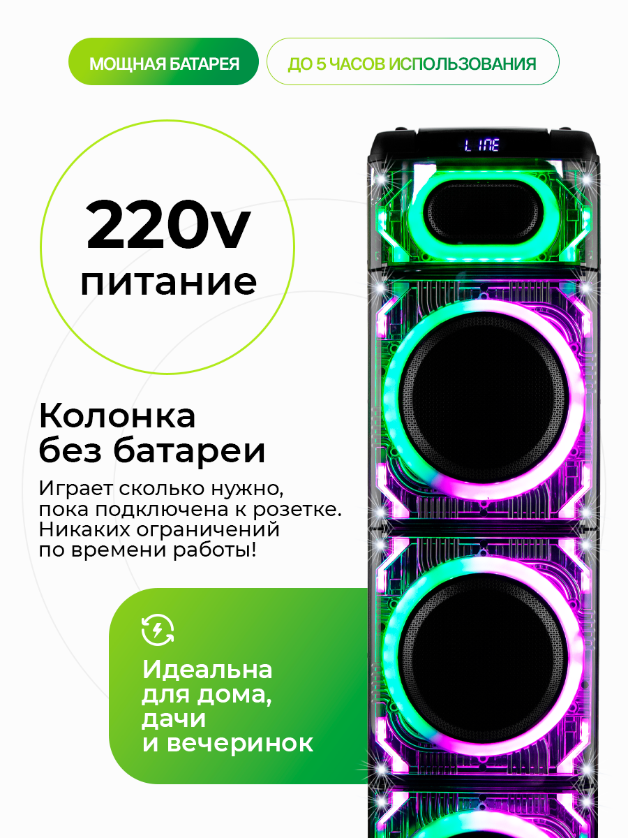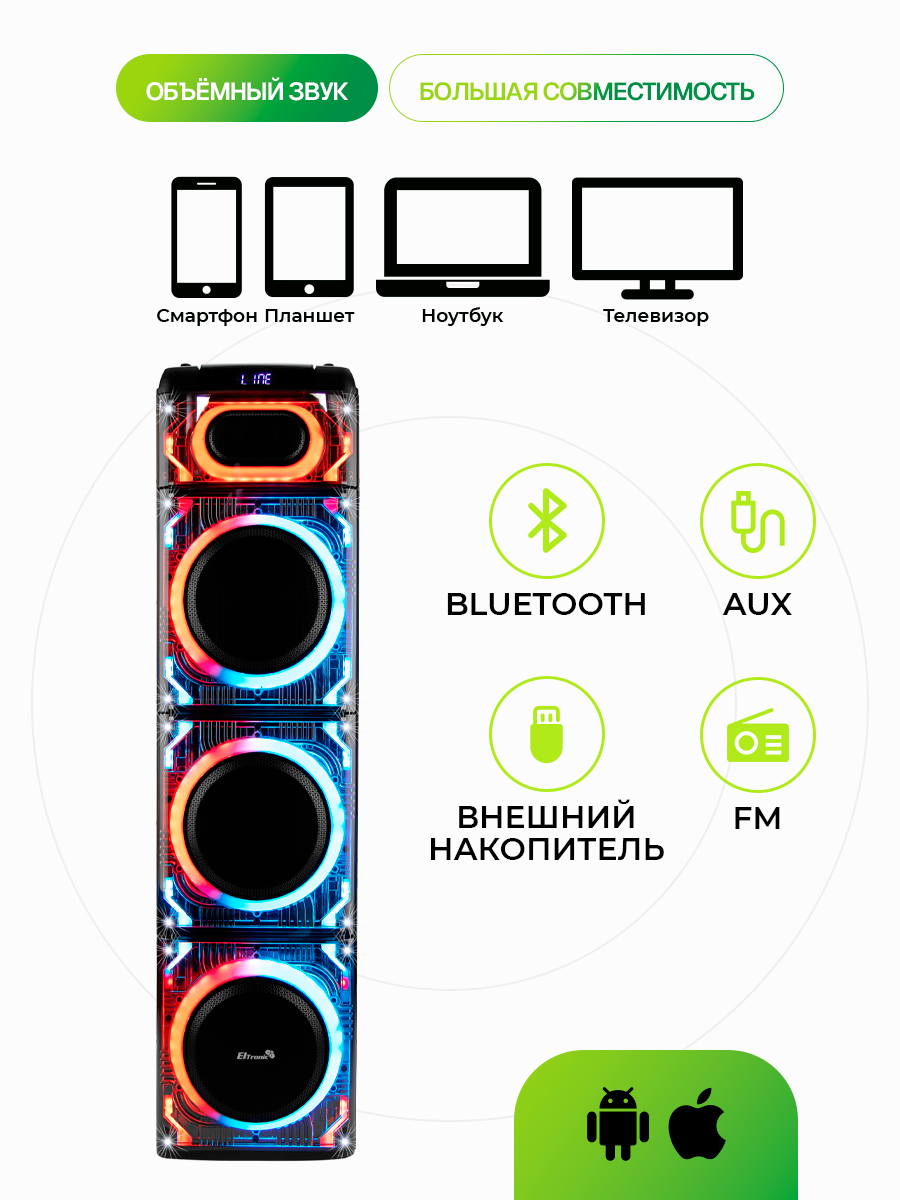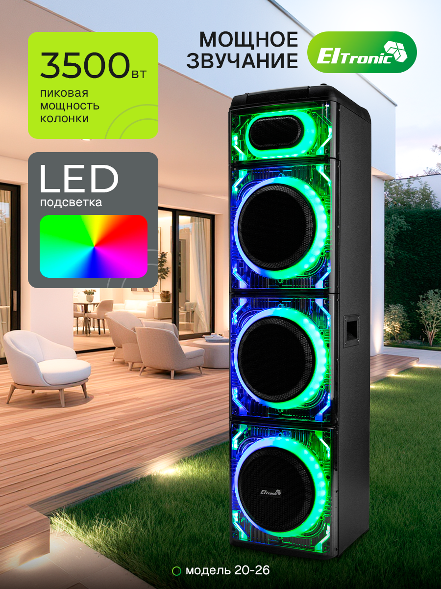 Описание Акустическая система Eltronic 20-26 Skillets Box 3500 ElTRONIC 20-26 SKILLETS BOX - это акустическая колонка, которая обеспечивает мощное и качественное звучание благодаря трем 10-дюймовым динамикам. Устройство поддерживает различные режимы воспроизведения: Bluetooth, внешний накопитель, Aux и FM. Это позволяет легко подключить колонку к различным устройствам и наслаждаться музыкой без проводов. Мощность колонки составляет 3500 Ватт PMPO и 350 Ватт RMS, что гарантирует громкий и чистый звук. Частотный диапазон колонки - от 50Hz до 20KHz, а сигнал/шум - 86dB. Питание колонки осуществляется от сети 220V. Устройство оснащено различными разъемами: USB, MicroSD, SD, Jack 6.3 мм для микрофона и гитары. Это позволяет подключать к колонке различные устройства и носители информации. В комплекте с колонкой идут беспроводной микрофон (2 шт), пульт, кабель AUX и инструкция. Дополнительно колонка оснащена TWS функцией, которая позволяет соединять две колонки в акустическую систему через Bluetooth. Также есть дисплей, регулировка звучания микрофонов, LED подсветка динамика и шести полосный эквалайзер. Размеры упаковки составляют 38 см в ширину, 134 см в высоту и 38 см в глубину, а вес нетто - 30 кг. ElTRONIC 20-26 SKILLETS BOX - это мощная, функциональная и стильная акустическая колонка, которая станет отличным выбором для любителей качественного звука.