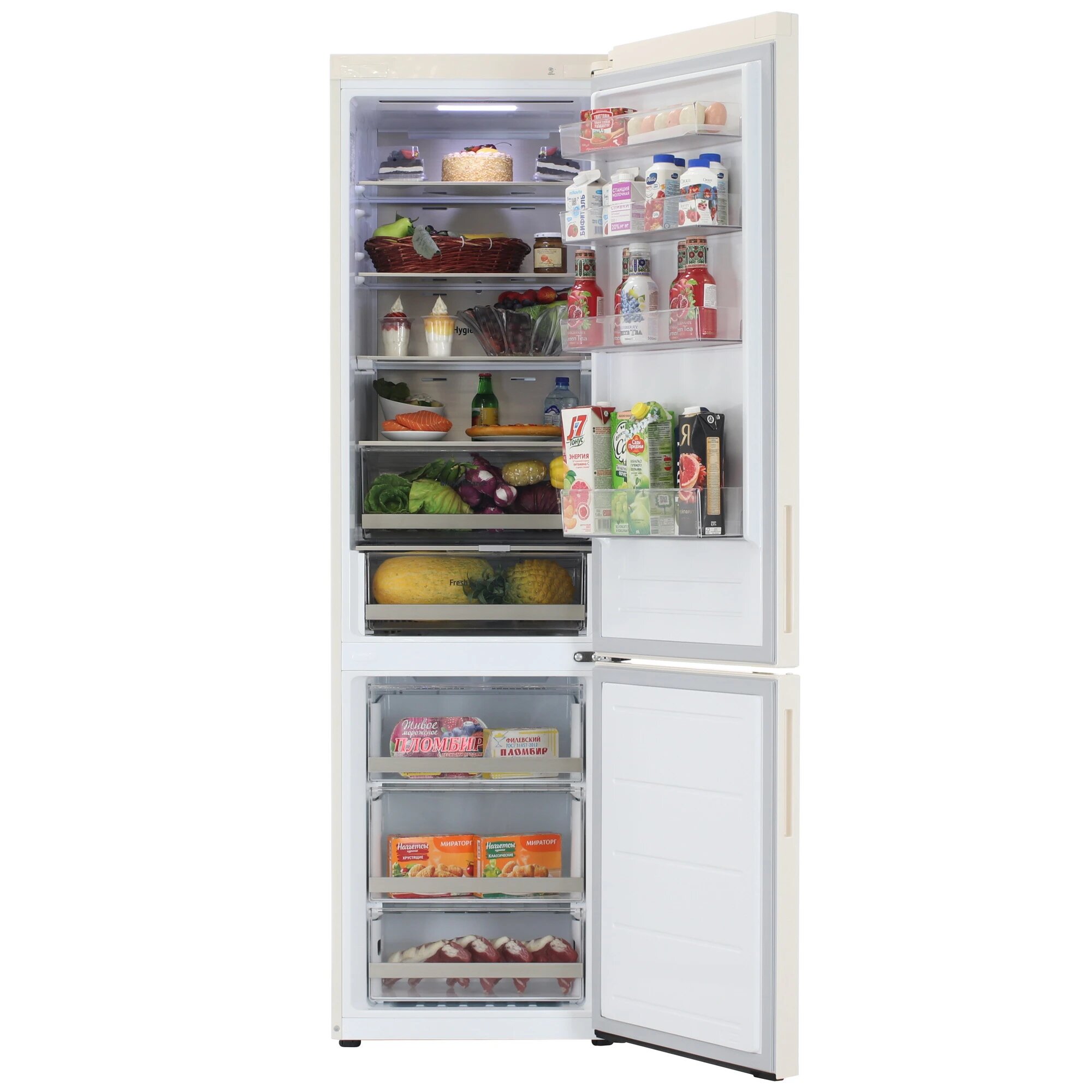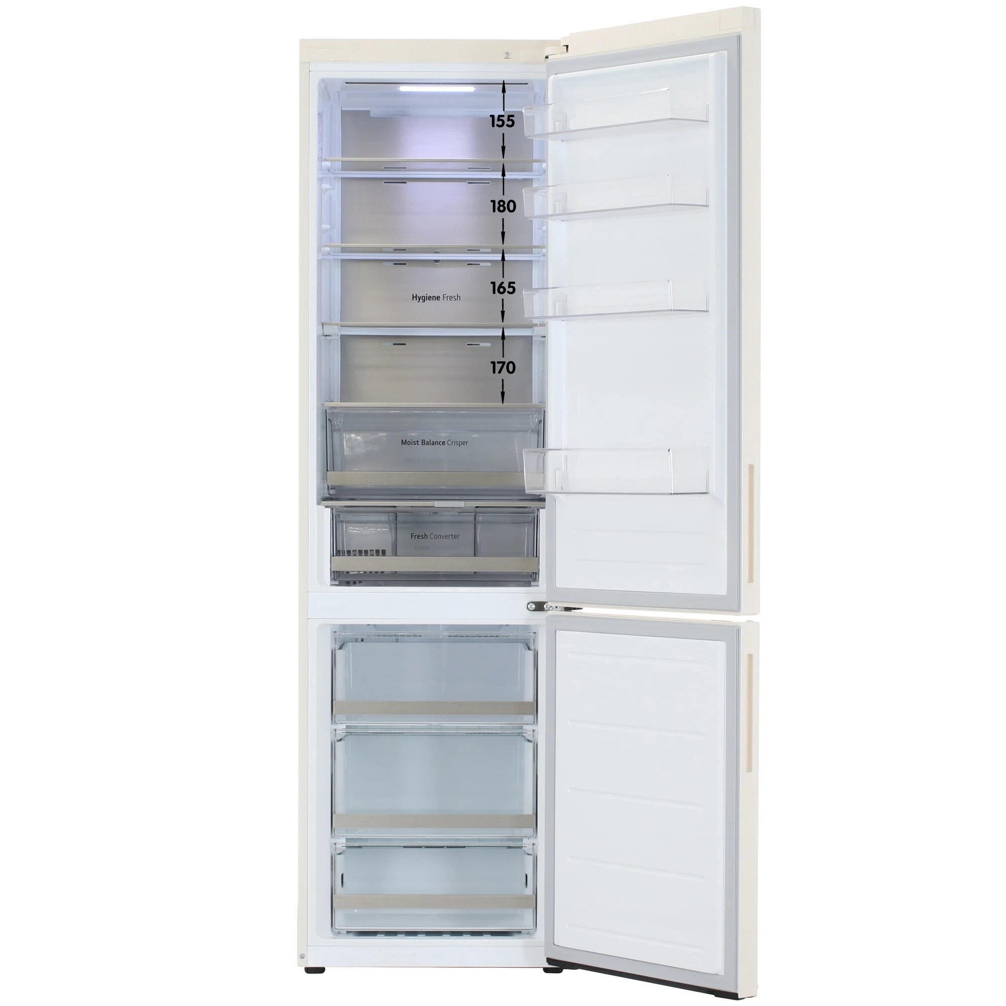Описание Холодильник LG GC-B509 AEPW Холодильник LG GC-B509 AEPW — отдельностоящий прибор с инверторным компрессором. Модель выполнена в сдержанном бежевом цвете и характеризуется привлекательным дизайном, который гармонично вписывается в интерьер современной кухни. Некоторые особенности холодильника: Система DoorCooling+ обеспечивает подачу дополнительного потока охлаждённого воздуха сверху холодильной камеры, что гарантирует поддержание стабильной температуры по всему объёму. Складная полка позволяет двухэтапно складывать, что облегчает размещение крупногабаритных предметов и улучшает эргономичность внутреннего пространства. Пятиступенчатый фильтр HygieneFresh удаляет до 99,9% загрязнений воздуха, включая пылевые частицы, плесневые грибы, кислотные и щелочные запахи, а также бактериальные загрязнения. Функция No Frost предотвращает образование наледи, избавляет от необходимости регулярного размораживания. Управление осуществляется посредством интеллектуального интерфейса ThinQ, который позволяет дистанционное управление температурой, получение уведомлений о работе оборудования и настройку комфортного температурного режима.