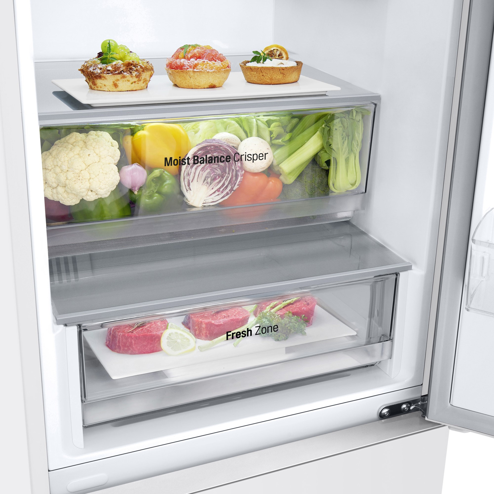 Описание Холодильник LG GC-B509 AQQW Холодильник с морозильником LG GC-B509 AQQW выполнен в прочном корпусе. Разморозка холодильной и морозильной камер происходит по технологии No Frost. То есть по мере намерзания инея на стенках происходит растапливание его и стекание в специальный резервуар. Минимальная температура морозильной камеры -23°С, это позволит длительно хранить все виды продуктов. При отключении питания температура будет поддерживаться в течение 16 ч. LG GC-B509 AQQW имеет влажную зону свежести. Это позволит хранить в оптимальных условиях такие продукты, как ягоды, грибы, зелень и фрукты. На корпусе холодильника находится дисплей, где отображаются параметры настройки. Индикация открытой двери не даст вам забыть закрыть холодильник. Антибактериальное покрытие не позволит бактериям размножаться на нем и создавать условия для порчи продуктов.