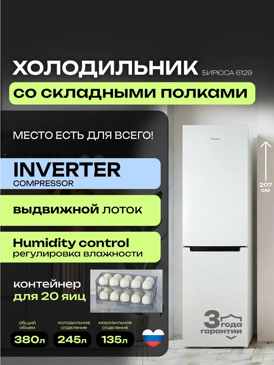 Описание Холодильник Бирюса 6129 Ищете двухкамерный холодильник, который сочетает надежность, вместительность и тихую работу? Холодильник Бирюса 6129 — идеальное решение для вашей семьи! Этот двухкамерный холодильник Бирюса с общим объемом 380 литров создан для тех, кто ценит порядок и свежесть. Холодильник с морозильной камерой на 135 литров позволит вам делать стратегические запасы и хранить замороженные продукты долгое время. Ключевые преимущества: Тихий и экономичный: Инверторный холодильник оснащен современным компрессором, который работает практически бесшумно и плавно регулирует мощность. Это не только комфорт, но и реальная экономия: высокий класс энергоэффективности A++ снижает расходы на электроэнергию. Умное хранение без хлопот: Капельная система размораживания в холодильном отделении избавит вас от рутинной ручной разморозки. А продуманная организация внутри — две складные полки, выдвижной лоток, полка для бутылок и контейнер для 20 яиц — поможет оптимально использовать каждый сантиметр пространства. Удобство в деталях: Горизонтальная светодиодная подсветка ярко освещает все содержимое холодильника, а автоматический доводчик двери плавно и бесшумно закрывает ее за вами. Система контроля влажности Humidity Сontrol помогает дольше сохранять свежесть овощей и фруктов.