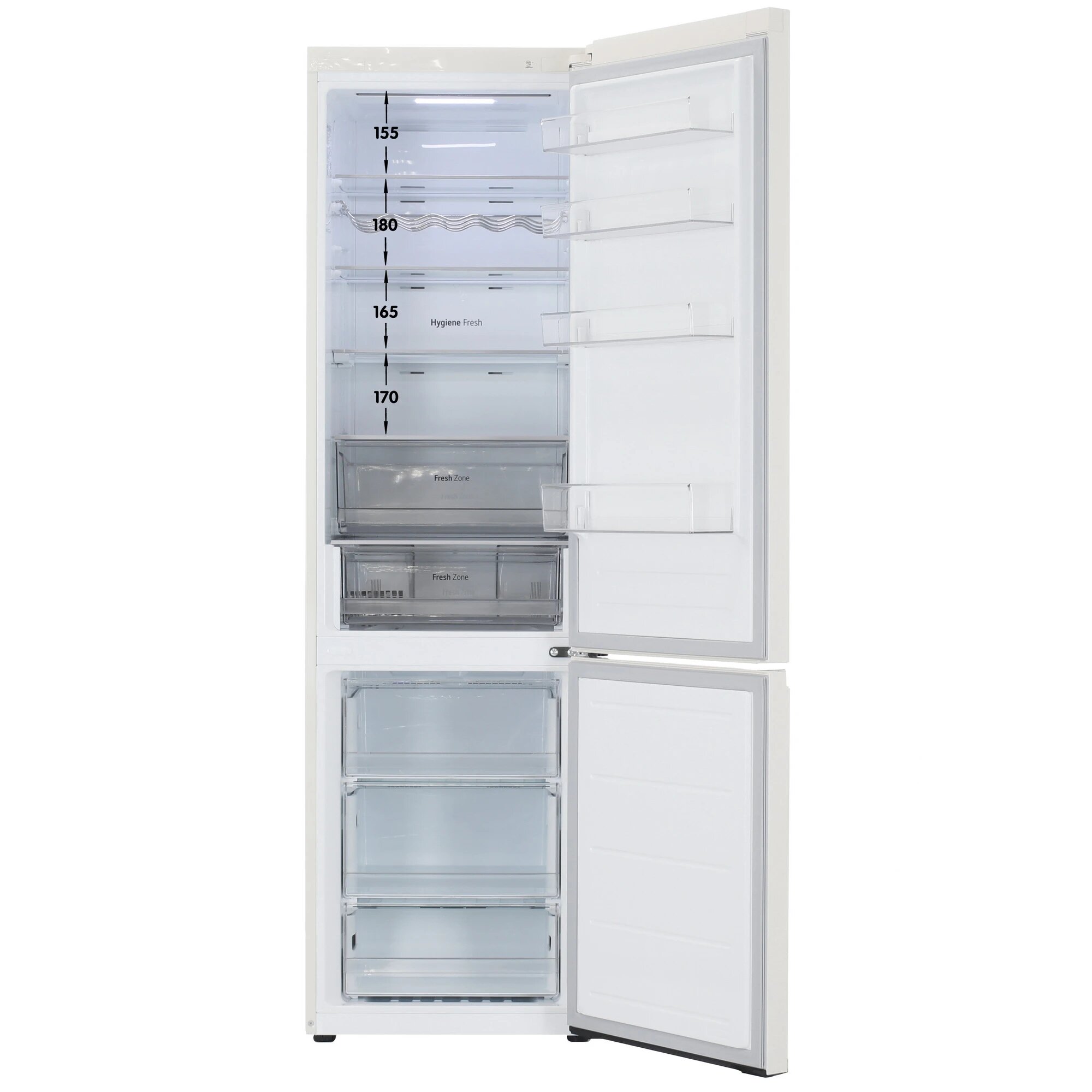 Описание Холодильник LG GC-B509 FEMW Холодильник LG GC-B509 FEMW представлен в бежевом цвете. Он оснащен холодильной и морозильной камерами с общим полезным объемом 387 л. Система No Frost исключает появление наледи и необходимость регулярного размораживания. Благодаря технологии Door Cooling+ подается дополнительный поток воздуха из верхней части холодильного отделения. Система Multi Air Flow циркулирует воздух по всему внутреннему пространству. Это обеспечивает сохранение свежести продуктов. Технология Hygiene Fresh+ на основе 5-этапной фильтрации устраняет появление плесени, грибковых спор, бактерий, неприятных запахов. Холодильник LG GC-B509 FEMW оснащен дисплеем с индикацией температуры и режимов. Поддерживается удаленное управление через приложение LG ThinQ. Складная полка предусматривает оптимизацию пространства в зависимости от размеров посуды и продуктов. Инверторный компрессор гарантирует тихую, энергоэффективную и стабильную работу холодильника.