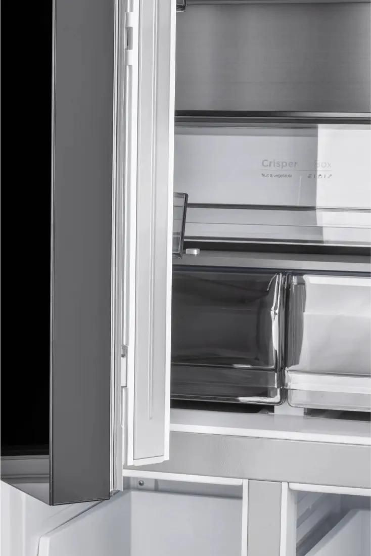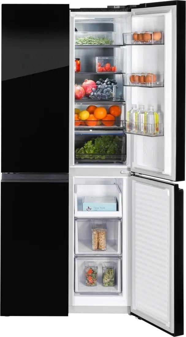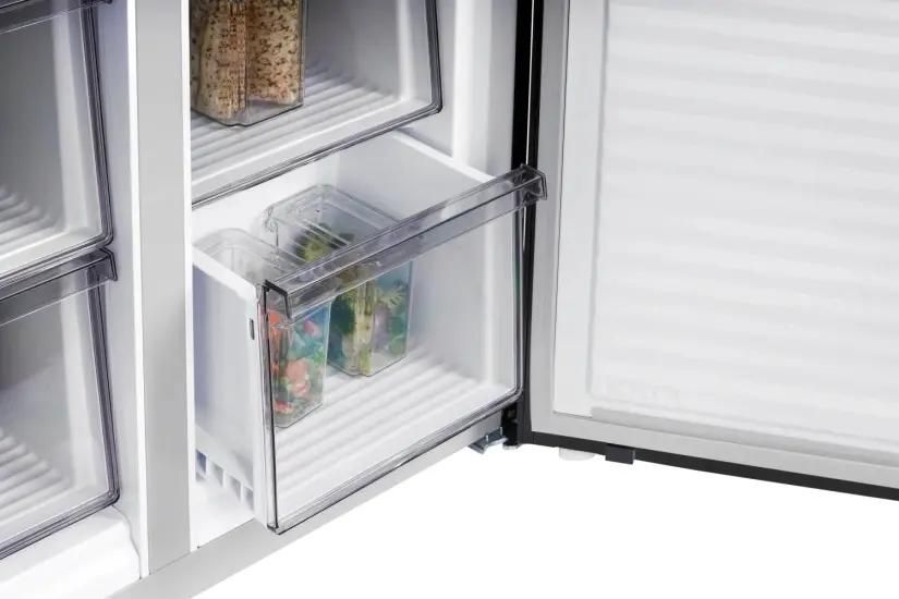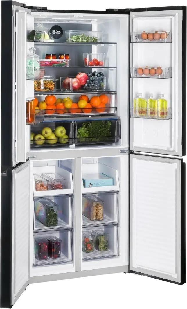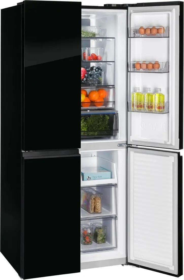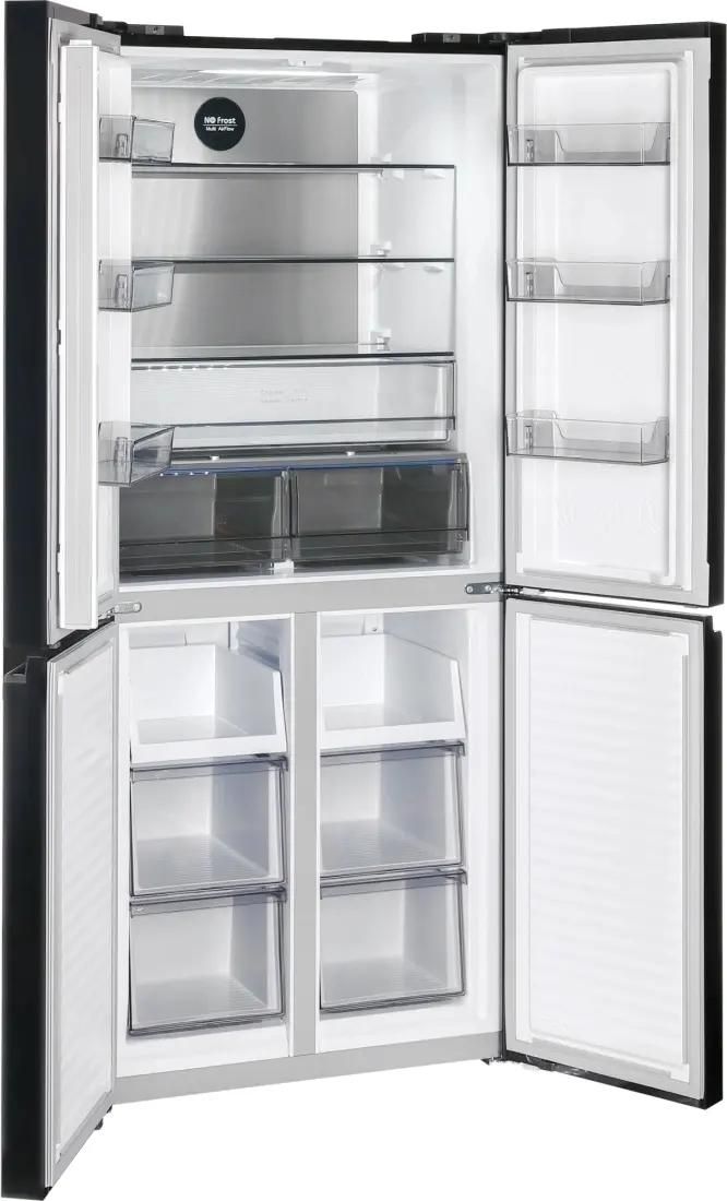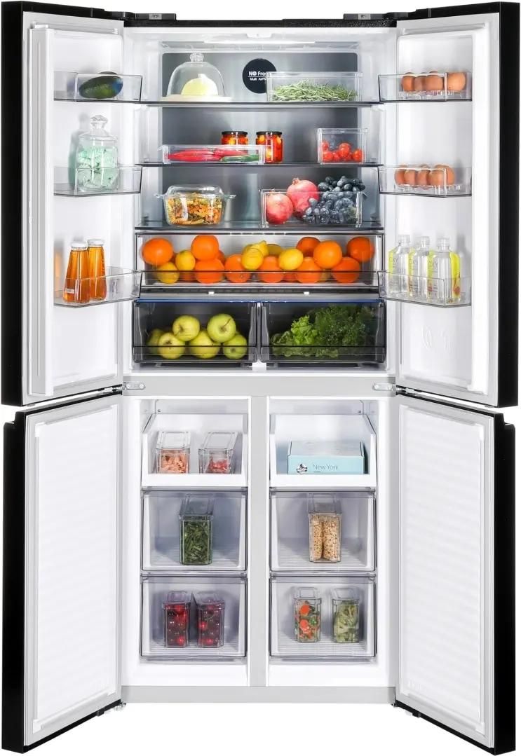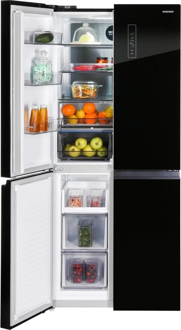Описание Холодильник NORDFROST RFQ 450 NFGB Трехкамерный холодильник Nordfrost RFQ 450 NFGB с современным дизайном в черном глянцевом исполнении отлично впишется в любой интерьер кухни. Общий объем 451 литр предоставляет достаточно места для хранения продуктов всей семьи. Полезный объем холодильной камеры составляет 270 литров, что удобно для свежих продуктов. Морозильная камера расположена внизу и имеет полезный объем 135 литров. Это позволяет удобно хранить замороженные продукты и быстро к ним получать доступ. Система Total No Frost автоматически размораживает холодильник и предотвращает образование инея, облегчая уход за техникой. Инверторный компрессор работает тихо — уровень шума всего 37 дБ. Он также экономит электроэнергию, снижая затраты на электричество. Электронное управление с внешним дисплеем упрощает контроль температуры. Есть режимы суперзаморозки и суперохлаждения для быстрой обработки продуктов. Регулируемые по высоте ножки обеспечивают устойчивость на любой поверхности и удобство установки в кухонном пространстве.