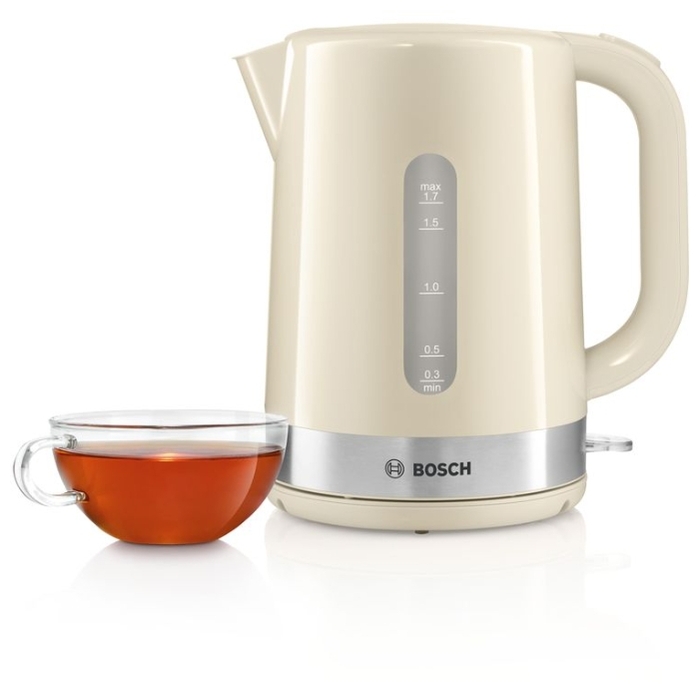 Описание Электрочайник Bosch TWK 7407 Электрочайник Bosch TWK 7407 – надёжный прибор со скрытым нагревательным элементом мощностью 2200 Вт, который позволит вам быстро вскипятить воду для различных напитков. Благодаря откидывающейся крышке его удобно наполнять, а просторное окошко с мерной шкалой покажет уровень жидкости в колбе. Легко читаемая шкала уровня воды, которую видно с обеих сторон чайника, делает чайник удобным и для леворуких, и для праворуких пользователей. Тройная безопасность: автоматическое отключение, защита от перегрева и отключение при отсутствии воды, автоматическое отключение при снятии с цоколя. Эргономичное управление: крышка легко открывается нажатием кнопки. Скрытый нагревательный элемент для легкой очистки Фильтр от накипи.