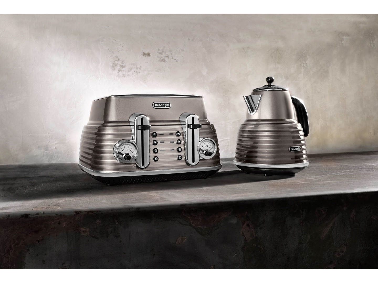 Электрический чайник DeLonghi KBZ 2001. — это воплощение стиля и функциональности. Корпус чайника рифлёный, выполнен в бежевом цвете с хромированными деталями. Такой прибор станет примечательным элементом на вашей кухне. Индикатор уровня воды показывает сколько жидкости осталось в приборе. Вы сможете купить не просто красивую технику, но и надёжную. Так как прибор оснащён 3-уровневой защитой. Чайник не включается если он без воды и если его неправильно установили. Когда вода закипает автоматически срабатывает выключение.