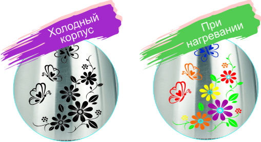 термоиндикатор в виде цветочного рисунка (становится разноцветным при нагреве)