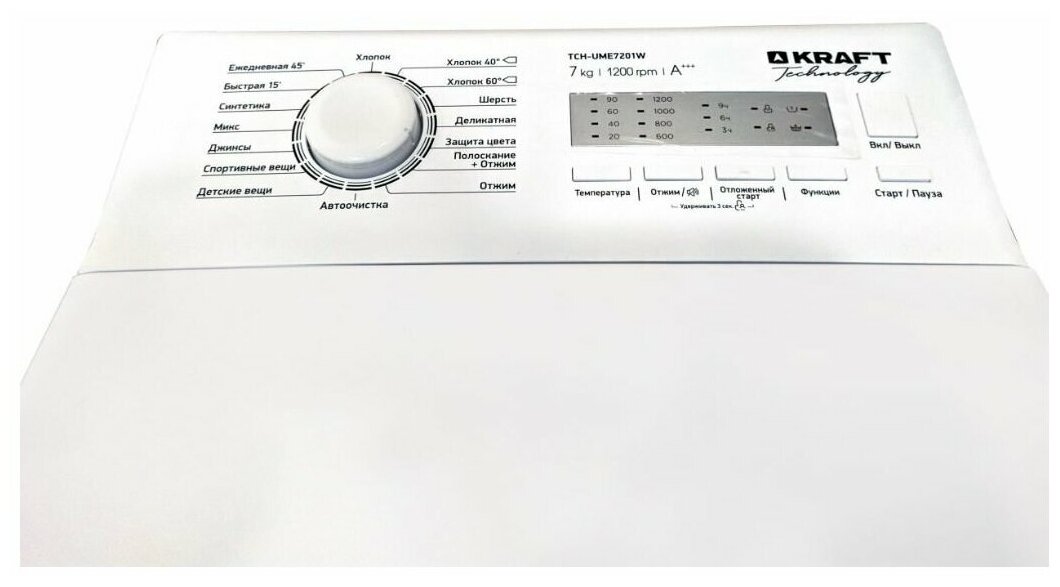 Описание Стиральная машина KRAFT TCH-UME7201W Стиральная машина KRAFT TCH-UME7201W с вертикальной загрузкой и цифровым дисплеем станет отличным решением вопроса о постоянной стирке вещей. Большой объем способен вместить до 7 кг белья, чего более чем достаточно для повседневной стирки даже в самой большой семье. Высокая функциональность стиральной машины достигается за счет большого количества программ, среди которых «Ручная стирка», «Детская одежда», «Джинсы», «Шерсть», «Спортивная одежда» и даже «Супербыстрая стирка». Именно поэтому стиральная машина KRAFT TCH-UME7201W может считаться универсальной, ведь в ней можно стирать практически все детали вашего гардероба. А функции отсрочки запуска, ускоренной стирки, дополнительного полоскания и добавления белья во время стирки делает использование техники еще комфортнее. Очередное преимущество устройства — звуковой сигнал, который проинформирует вас об окончании процесса. За безопасность тоже можно не переживать, потому что в стиральной машине KRAFT TCH-UME7201W предусмотрена защита от протечек и детей, а также контроль дисбаланса и пенообразования. Экономичный уровень энергопотребления поможет вам в экономии воды и электроэнергии.