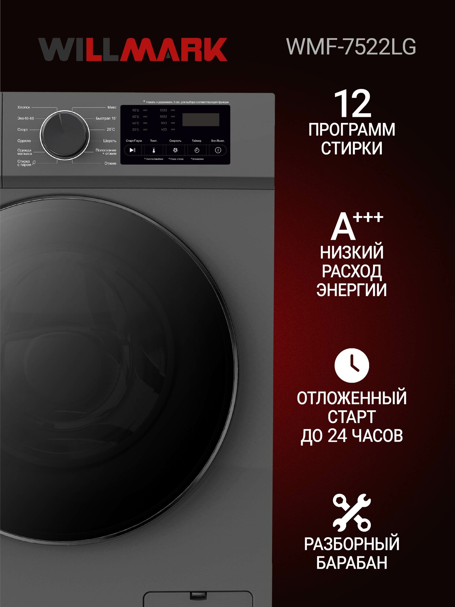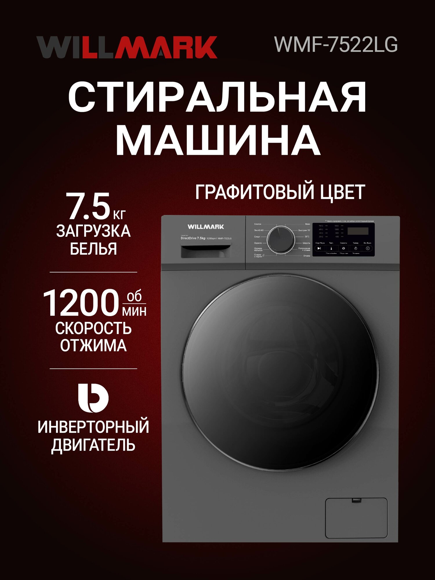 Описание Стиральная машина Willmark WMF-7522LG Inverter Direct Drive Стиральная машина WILLMARK WMF-7522LG с инверторным двигателем с прямым приводом станет отличным приобретением для большой семьи, ведь она рассчитана на 7,5кг загрузки сухого белья. Модель поддерживает 12 программ с разнообразными настройки для адаптации цикла под определенную ткань или тип вещей. Температура, при которой ведется стирка, может быть изменена на усмотрение пользователя, вплоть до режима обеззараживания +90 градусов С. Если стирку необходимо запланировать на удобное время, можно воспользоваться отложенным стартом (до 24 часов). Благодаря стильному и современному дизайну, данная модель в графитовом цвете отлично впишется в любой интерьер. Стиральная машина WILLMARK WMF-7522LG — это незаменимый и помощник в доме.