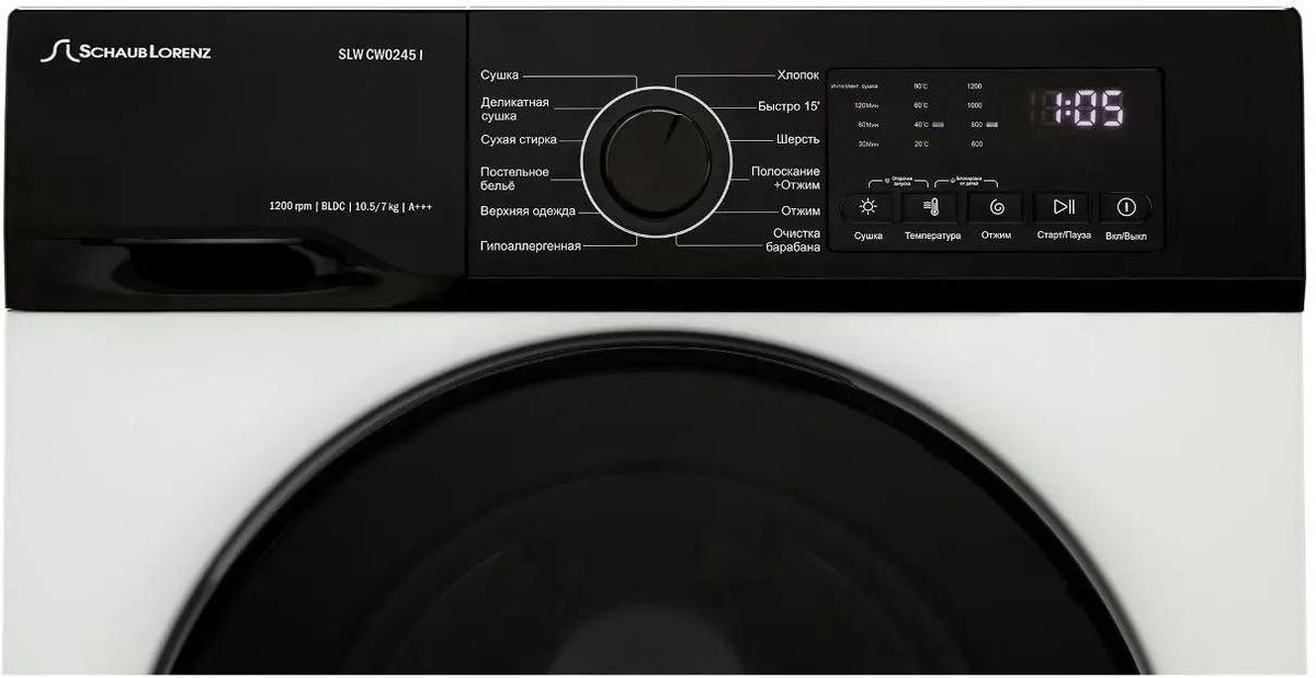 Описание Стиральная машина Schaub Lorenz SLW CW0245 I Стирально-сушильная машина SLW CW0245 I с загрузкой 10,5 кг для стирки и 7 кг для сушки – идеальное решение для ухода за объёмными вещами. Машина оснащена инверторным мотором: благодаря этому она работает тише стандартных машин, экономно расходует электроэнергию и прослужит дольше. К преимуществам модели также можно отнести: 9 программ стирки и 3 программы сушки, среди которых: шерсть, постельное белье, быстрая стирка, сухая стирка и т.д. Продуманный функционал и возможность регулировать температуру и скорость отжима самостоятельно помогут подобрать оптимальный режим для любого типа одежды Программа "Очистка барабана" поможет вам избавиться от накопившейся грязи и накипи Гипоаллергенная программа эффективно удаляет аллергены, бактерии и остатки стиральных средств из ткани Программа "Сухая стирка" поможет обеззаразить и дезодорировать белье с помощью циркуляции горячего воздуха. Идеально для стирки белья чувствительного к высоким температурам. LED-дисплей с индикацией времени до конца стирки понятен и удобен в использовании Половинная загрузка Eco-Logic поможет снизить потребление электроэнергии до 50% при неполной загрузке. Функция отложенного старта (от 3 до 24 часов) позволит запустить цикл стирки в любое удобное для вас время. Отличное решение для тех, кто использует ночной тариф или хочет вернувшись домой, достать свежее белье после стирки. Безопасность: Для обеспечения безопасности доступны функции защиты от протечек и защиты от детей. Также присутствуют контроль дисбаланса и контроль пенообразования. Высокий класс энергоэффективности А+++: стиральная машина затрачивает меньше электроэнергии, чем стандартные модели, при этом обеспечивая превосходное качество стирки.