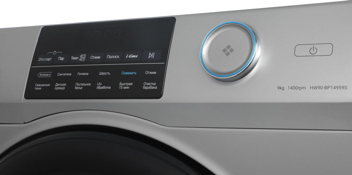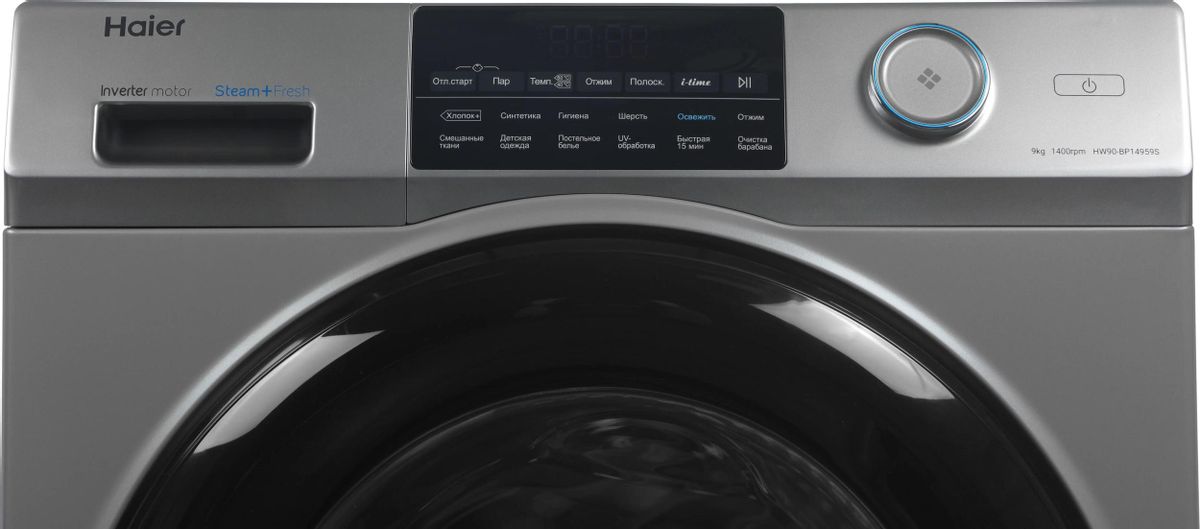 Описание Стиральная машина Haier HW90-BP14959S i-Time Применение функции автоматически оптимизирует настройки времени для уже выбранной вами программы стирки. Программа «Быстрая 15 мин» Для экономии времени, воды и моющих средств, короткая программа справится с незначительными загрязнениями вещей из хлопка и синтетики. Инверторный мотор с гарантией 12 лет Современный бесщёточный мотор: тихий и долговечный, благодаря уменьшению точек трения. Инверторный контроль мощности снижает расход электроэнергии. Гарантия — 12 лет. UV-обработка Удаление аллергенов и вирусов с помощью ультрафиолета — гигиеническая чистота как вашей одежды, так и самой стиральной машины. Ультрафиолет на страже гигиенической чистоты вашего белья и здоровья вашей семьи. Smart Dual Spray Манжета и внутренняя поверхность стекла дверцы люка автоматически омываются при стирке чистой водой. Продуманное решение для гигиены и легкости ухода за стиральной машиной. Шланг с Aquastop Сохранит ваше спокойствие во время стирки. Больше нет необходимости находиться дома, пока идет стирка: механическая система защиты перекроет подачу воды в случае утечки. Барабан Pillow Внутренняя поверхность стирального барабана имеет форму подушечек. Ткань легко скользит по ним — вещи стираются очень бережно, но эффективно. Даже самые деликатные. Программа освежения паром Любая одежда, даже та, которую нельзя стирать в стиральной машине, будет приведена в порядок: пар удалит запахи, вернет прежнюю форму и разгладит складки. Установка сушильной и стиральной машины в колонну Идеальная и эргономичная пара для организации пространства и вашего удобства — установка сушильной и стиральной машины в колонну с помощью соединительного элемента. Стиральная машина Haier HW90-BP14959S с 9-килограммовой загрузкой оснащена инверторным двигателем, обеспечивающим тихую работу и долгий срок службы. Дизайн выполнен в серебристом цвете, с понятным и удобным дисплеем, который отображает время стирки, выбранную программу и дополнительно примененные опции. С помощью поворотного селектора вы можете легко переключаться между режимами стирки. Регулируйте скорость отжима, в зависимости от типа тканей или собственных пожеланий, используя широкий диапазон значений от 400 до 1400 оборотов. Стандартный набор программ, таких как «Хлопок», «Синтетика», «Смешанные ткани», «Шерсть» расширен функцией добавления пара, который разглаживает волокна ткани, делая одежду еще более свежей и легкой. Технология UV-обработки оказывает двойное действие — эффективно удаляет бактерии и аллергены с поверхности вещей, а также обрабатывает внутреннее пространство барабана самой стиральной машины.