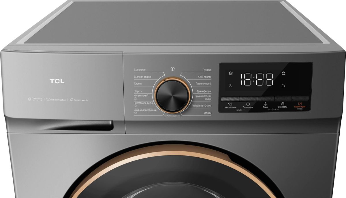 Описание Стиральная машина TCL TWRP-1108W12G2 Стиральная машина TCL TWRP-1108W12G2 в сером корпусе из металла обеспечивает эффективный уход за бельем. Компактные габариты 85х60х45,6 см позволяют легко разместить устройство в ограниченном пространстве. Прямой привод и инверторный мотор Конструкция исключает промежуточные элементы, передавая движение барабана напрямую. Инверторная технология мотора гарантирует точный контроль скорости вращения. Сотовый барабан Создает защитную водяную пленку во время стирки. Решение минимизирует трение и механическое воздействие на ткани, сохраняя структуру и цвет материала. Многообразие программ Доступны программы «Быстрая стирка» (15 минут), «Антиаллергия», «Стерилизация», «Стирка с паром» и другие. Режим «ECO» обеспечивает экономию ресурсов, функция «Очистка барабана» поддерживает гигиену устройства. Интеллектуальный контроль Система безопасности включает защиту от детей, контроль дисбаланса и пенообразования. Датчик чистоты воды анализирует состояние воды, функция дозагрузки позволяет добавлять белье после начала цикла. Устройство демонстрирует класс энергоэффективности A, потребляя 1,2 кВт*ч электричества за цикл. Расход воды составляет 60 л, максимальная скорость отжима достигает 1200 об/мин. Уровень шума при стирке — 62 дБ, при отжиме — 76 дБ. Цифровой дисплей отображает этапы программы и оставшееся время, таймер позволяет отложить запуск машины на срок до 24 часов.