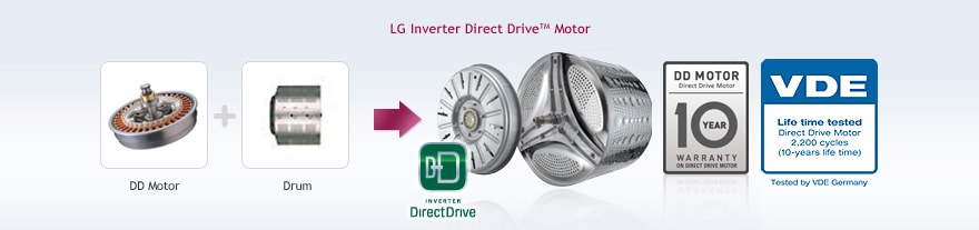 Система LG Inverter Direct Drive повышает эффективность двигателя путем отказа от ремня и шкива, что помогает снизить потребление электроэнергии и обеспечивает большую надежность машины. Эта упрощенная система также помогает уменьшить уровень шума.