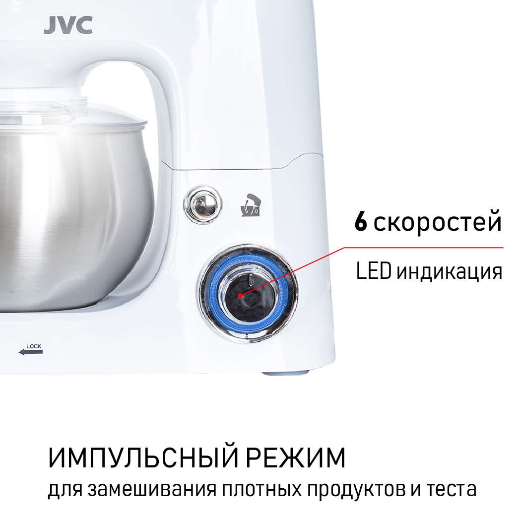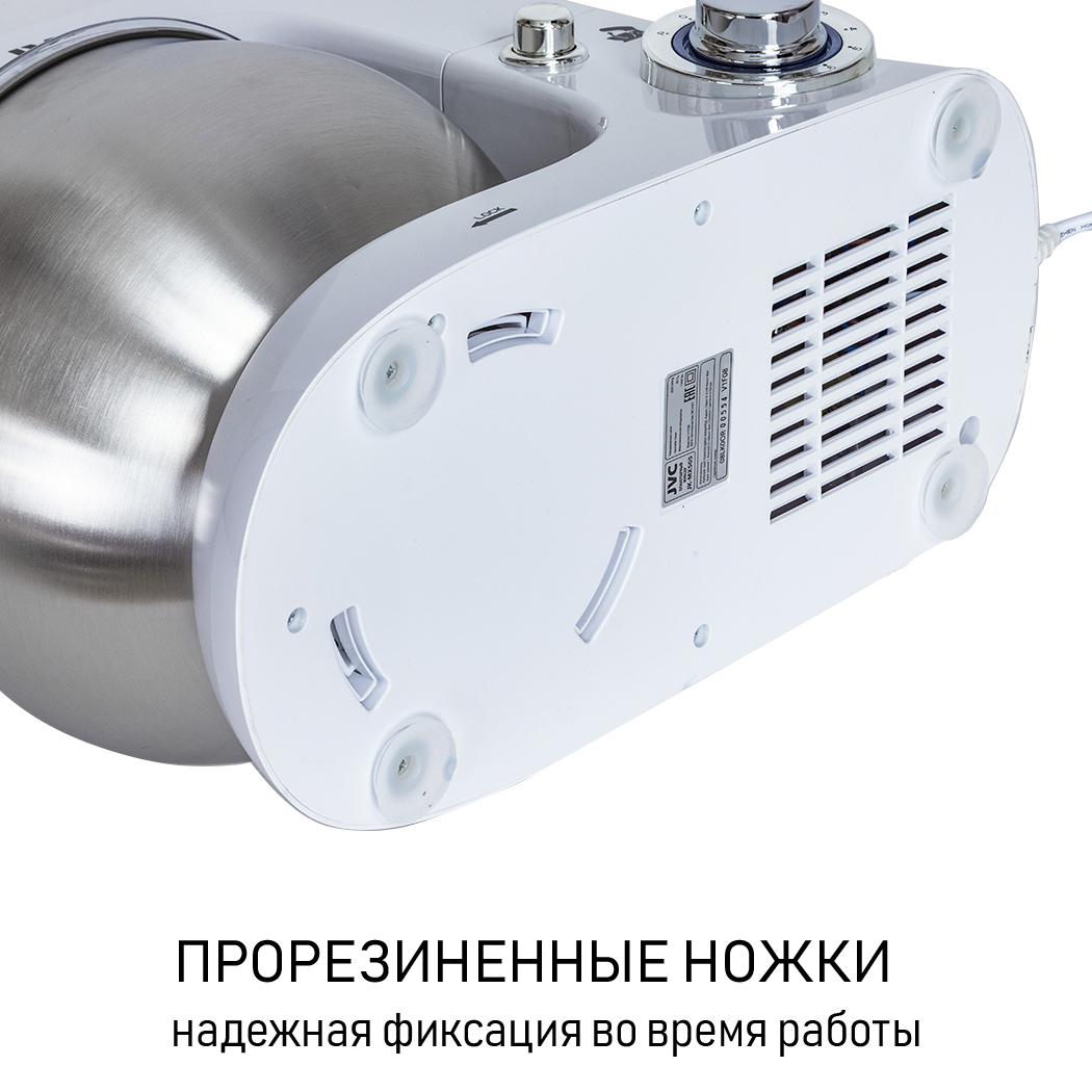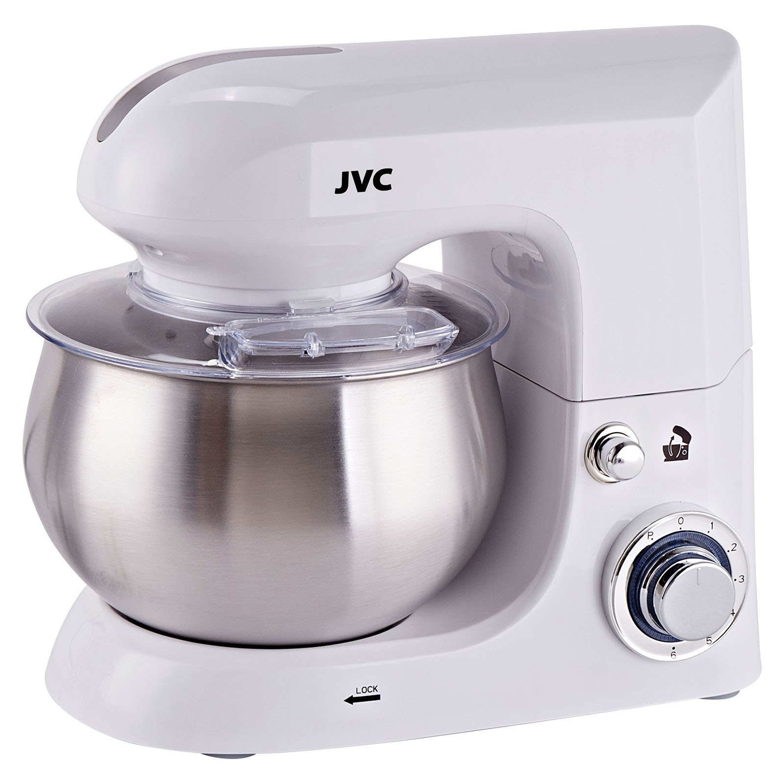 Описание Миксер JVC JK-MX505 Планетарный миксер JVC JK-MX505 с 5-литровой чашей из нержавеющей стали представляет собой современный стационарный прибор для замеса теста различной вязкости, взбивания яиц, сливок, кремов и муссов, приготовления пюре. Планетарная система смешивания обеспечивает вращение насадок вокруг своей оси и по окружности чаши, поэтому тесто и другие ингредиенты будут иметь идеальную однородную консистенцию. Миксер отлично справляется с «тяжелым» тестом, поэтому его часто используют в небольших пекарнях и домашних кондитерских. В комплекте поставляются три насадки: крючок для замеса теста, лопатка для перемешивания и венчик для взбивания. Миксер имеет 6 скоростей и импульсный режим работы. Прорезиненные ножки обеспечивают надежное сцепление с рабочей поверхностью.