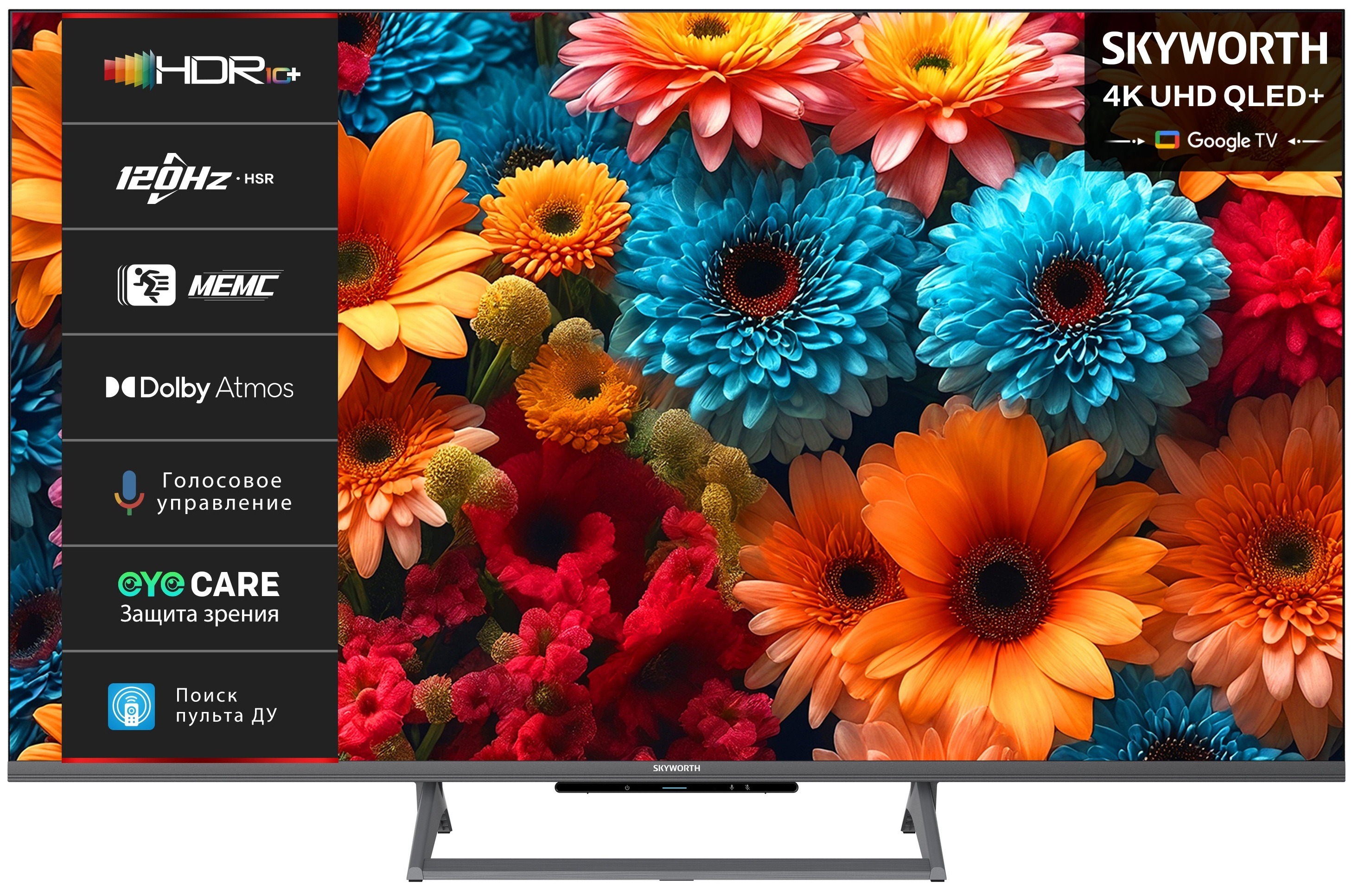 Описание Телевизор Skyworth 75Q67H Телевизор Skyworth 75Q67H — это 75-дюймовый Smart TV с потрясающим разрешением 4K UHD, который подарит вам незабываемое впечатление от просмотра фильмов, сериалов и спортивных трансляций. Технология QLED обеспечивает яркие и реалистичные цвета, а Dolby Vision и MEMC гарантируют плавное изображение с глубокими тенями и яркими бликами. Звуковая система с Dolby Atmos и Total Sonics создает объемный и захватывающий саундтрек, погружая вас в атмосферу происходящего на экране. Управление телевизором максимально удобно благодаря голосовому управлению и пульту ДУ. Smart TV на базе Google TV открывает доступ к огромному количеству приложений, фильмов и сериалов, а функция поиска пульта ДУ поможет вам быстро найти его, если он потерялся. Телевизор легко монтируется на стену, а его стильный серый дизайн впишется в любой интерьер.