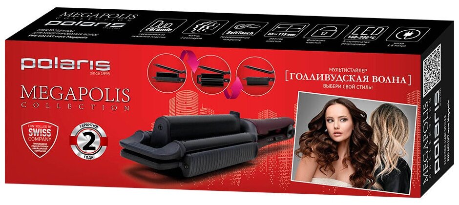 Описание Щипцы для волос Polaris PHS6011KT Щипцы для завивки волос Polaris PHS 6011KT wave Megapolis − тройные щипцы, предназначенные для укладки волос. С помощью этого прибора вы сможете создать красивую прическу с волнами «гофре» по всей длине волос. Керамическое покрытие рабочей поверхности отлично проводит тепло, распределяя его по локонам: волосы скользят между двумя половинками наконечников прибора. Такая поверхность нагревается медленнее, но защищает волосы от термических воздействий. Двойное покрытие керамикой по технологии DuoCeramic способствует сохранению здорового вида волос, а также обеспечивает долговечность и прочность рабочих пластин. Polaris PHS 6011KT wave Megapolis поддерживает нагрев от 160° до 200°, при этом предусмотрено 3 температурных режима с промежуточным 180°. Цветовая индикация режимов позволяет определить состояние, в котором устройство находится в данный момент, чтобы пользователю было легче менять температурный режим. Для удобного и бережного хранения щипцов их пластины фиксируются в закрытом положении с использованием защитной накладки.