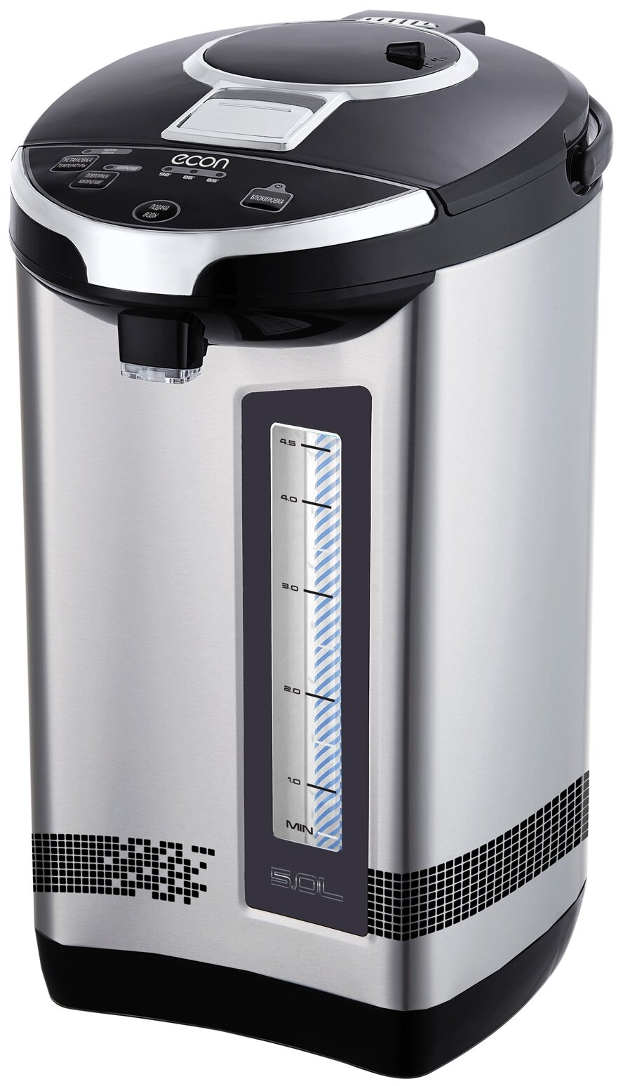 Описание Термопоты ECON ECO-504TP Выполненный в привлекательном дизайне и серебристом цвете термопот ECON ECO-504TP станет надежным помощником на кухне и в офисе. Его мощность в 750 Вт позволяет за несколько минут довести до кипения 5 л воды, что очень удобно при организации чаепития в большой семье, компании друзей или офисе. Сочетает в себе характеристики чайника и термоса - может греть и хранить горячей воду. При этом его использование абсолютно безопасно. Термопот ECON ECO-504TP выполнен из пищевой, нержавеющей стали, отличающейся прочностью, надежностью, полностью соответствующей требованиям безопасности и качества. Она не содержит в своем составе вредных или опасных компонентов, не деформируется, не подвергается коррозии. Подача поды производится нажатием кнопки.