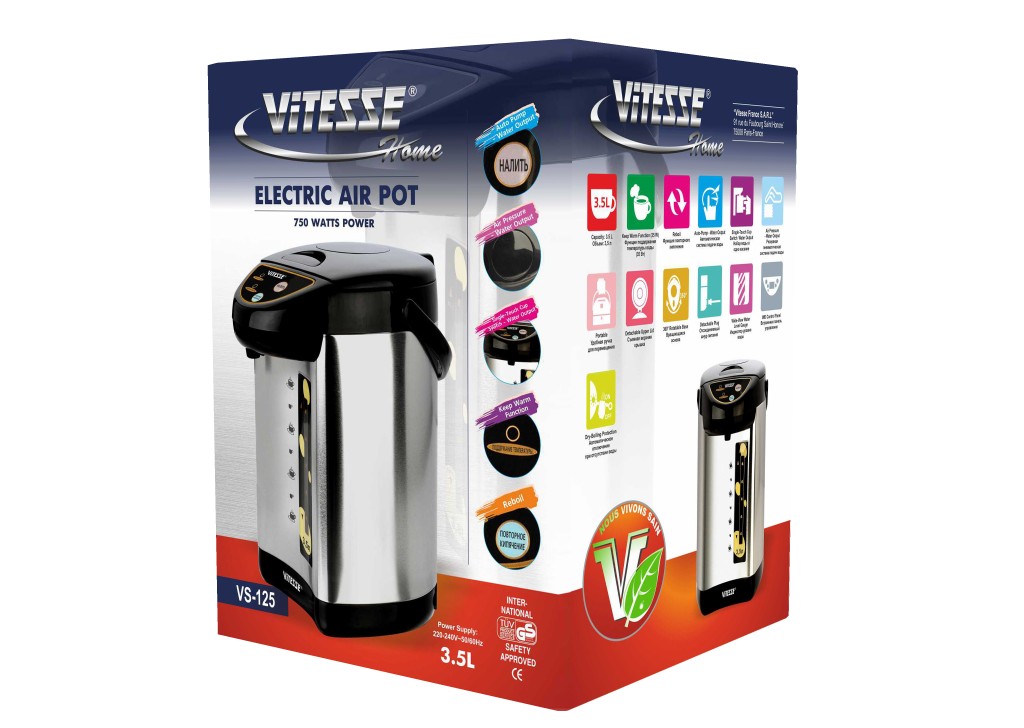 Термопот Vitesse VS-125 - лучшее решение для вашей кухни. В то время как обычный чайник на кухонной плите подогревает воду за 10-15 минут, термопот Vitesse VS-125 вскипятит ее за пару минут, а встроенная функция постоянного подогрева поможет сохранить воду горячей на целый день. Прекрасно впишется и дополнит любой интерьер. Корпус выполнен из стали и пластика.