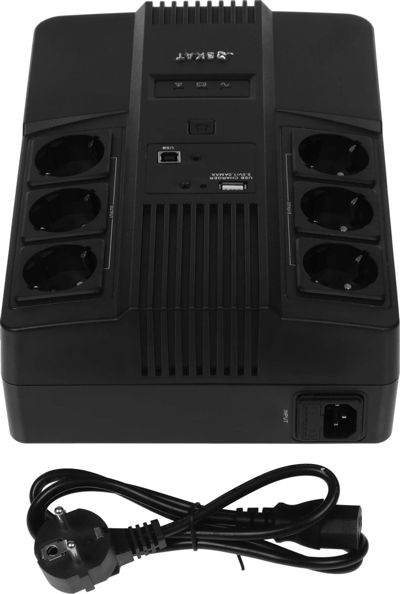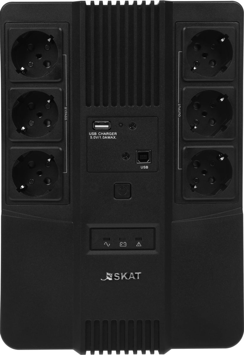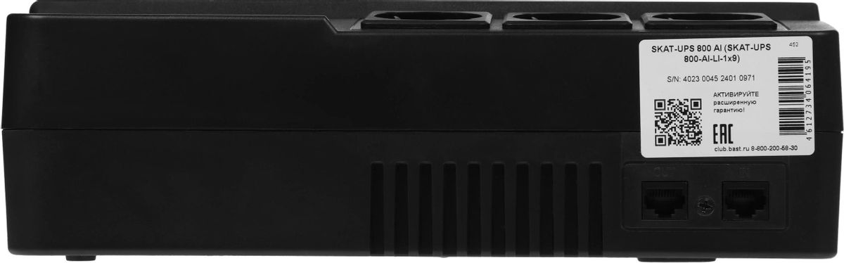 Описание Источник бесперебойного питания Бастион Skat 800 AI Бастион Skat 800 AI — надёжный российский источник бесперебойного питания 220 В, 800 ВА (480 Вт), имеет наиболее востребованные мощностные характеристики и идеально подходит для офисных целей. Встроенный АКБ 9 Ач, встроенная стабилизация, заряд и защита АКБ, защита нагрузки. Бастион Skat 800 AI — универсальный источник бесперебойного питания предназначен как для профессионального, так и для бытового назначения. Источник оснащён 6 розетками (с поддержкой и без поддержки резервной работы), выходом USB для зарядки мобильных устройств и портами RJ-45 для защиты локальной сети — всё что нужно для безопасной работы компьютерной техники. Удобное крепление на стену позволяет удобно разместить Бастион Skat 800 AI не занимая лишнего пространства на рабочем месте.
