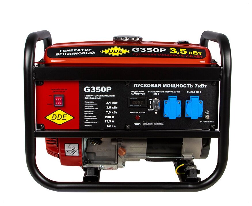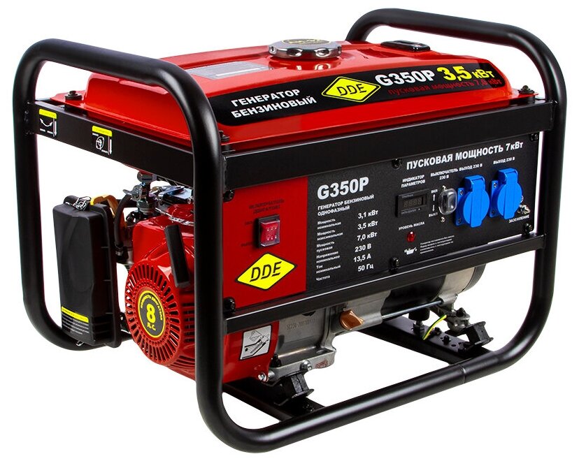 Описание Электрогенератор DDE G350P Генератор бензиновый DDE G350P (1ф, 3.1/ 3.5/ 7.0 кВт ) предназначен для производства переменного электрического тока путем преобразования механической энергии в электрическую. Изделие отвечает современным техническим стандартам качества, обеспечивая долгий и безопасный эксплуатационный период. Данные модели оснащены 4-х тактным двигателем внутреннего сгорания с воздушным охлаждением, синхронным альтернатором, блоком автоматической регулировки напряжения (AVR). Рекомендованы в качестве резервного источника тока с наработкой до 500 часов в год. Преимущества: Металлическая рама образует две ручки для удобного перемещения устройства. Специальные демпферные подушки прекрасно сглаживают вибрации во время работы генератора. Модель легко запускается при помощи ручного старта. Генератор создан специально для запуска асинхронных двигателей в компрессорах, насосах, мойках, станках и т. д. Может запускать нагруженные двигатели до 2,2 кВт включительно.
