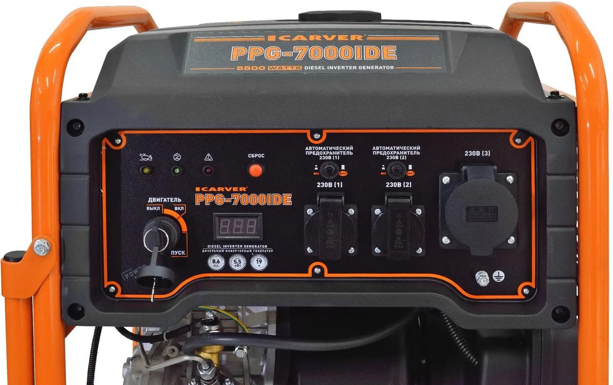 Описание Электрогенератор Carver PPG - 7000IDE [01.020.00071] Дизельный генератор CARVER PPG-7000IDE - современное устройство, для аварийного снабжения различной техники электрическим током. Установка успешно используется на даче, в загородном доме, а также на стройплощадке. Прочная металлическая рама и кожух обеспечивают жесткость конструкции и защищают внутренние узлы и детали от механических повреждений. Преимущества: Надежный дизельный двигатель. Электростартер (АКБ в комплекте). Экономичный расход топлива. Режим работы ~230В/50Гц. Цифровой дисплей. Аварийный датчик давления масла. Защита от перегрузки