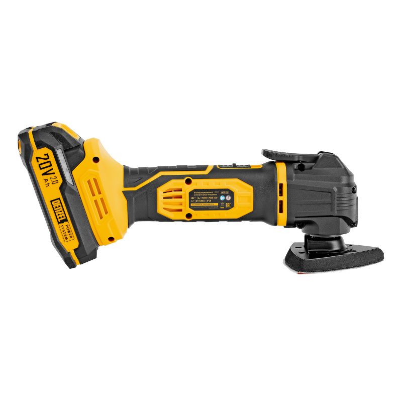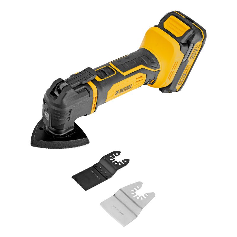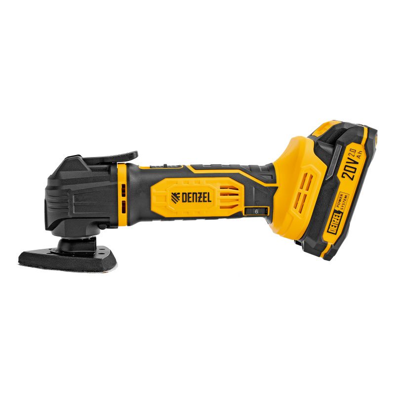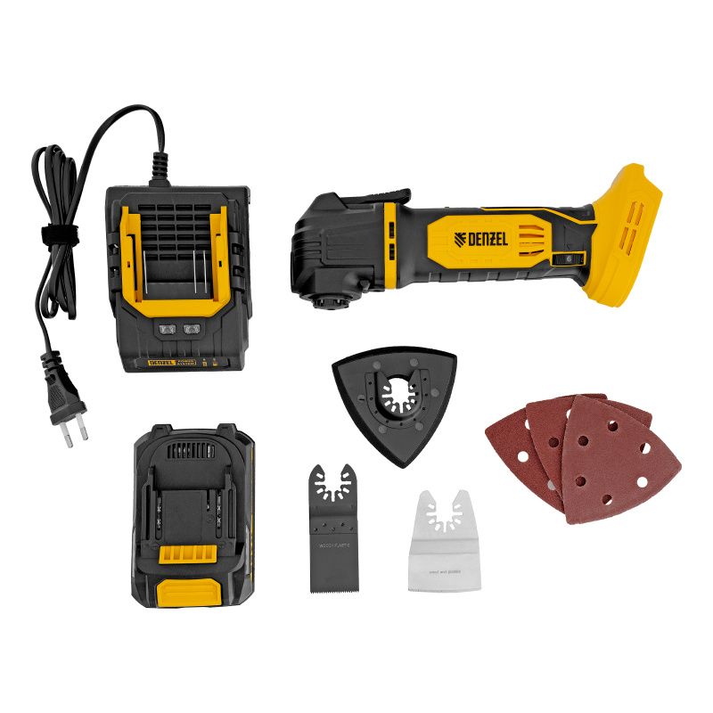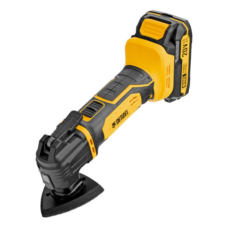 Описание Многофункциональный инструмент (реноватор) Denzel CMTH-20 [28405] Аккумуляторный многофункциональный инструмент Denzel CMTH-20 28405 работает от источника питания Li-Ion 20 В и используется для выполнения широкого спектра работ: зачистных, отрезных, шлифовальных и т.д. Совместим с различными видами оснастки и подходит для обработки практически любых материалов. Частота колебаний регулируется в диапазоне 5000-17000 об/мин, что позволяет эффективно решать поставленные задачи. Инструмент рекомендован для использования в быту. Преимущества Функция плавного пуска — инструмент включается без рывка. Простая подготовка к работе — благодаря быстросъемному механизму установка оснастки не занимает много времени и не требует использования дополнительных инструментов. Комфортная работа даже при слабом освещении — светодиодная подсветка рабочей зоны включается одновременно с запуском двигателя. Универсальность — аккумулятор Li-Ion емкостью 2 А·ч совместим со всеми инструментами единой платформы Denzel Power System 20V. Контроль уровня заряда — индикатор на корпусе батареи позволяет быстро определить, когда необходимо произвести подзарядку. Готовность к эксплуатации — в комплект поставки входит аккумулятор, зарядное устройство, полотно для древесины и пластика, шабер, шлифовальная подошва и набор шлифовальной бумаги. Степень защиты II — надежная изоляция предотвращает поражение электрическим током. Масса 0,83 кг — инструментом можно долго работать без ощущения усталости.