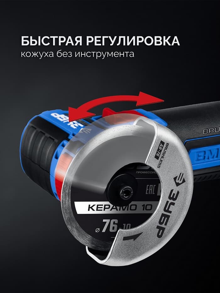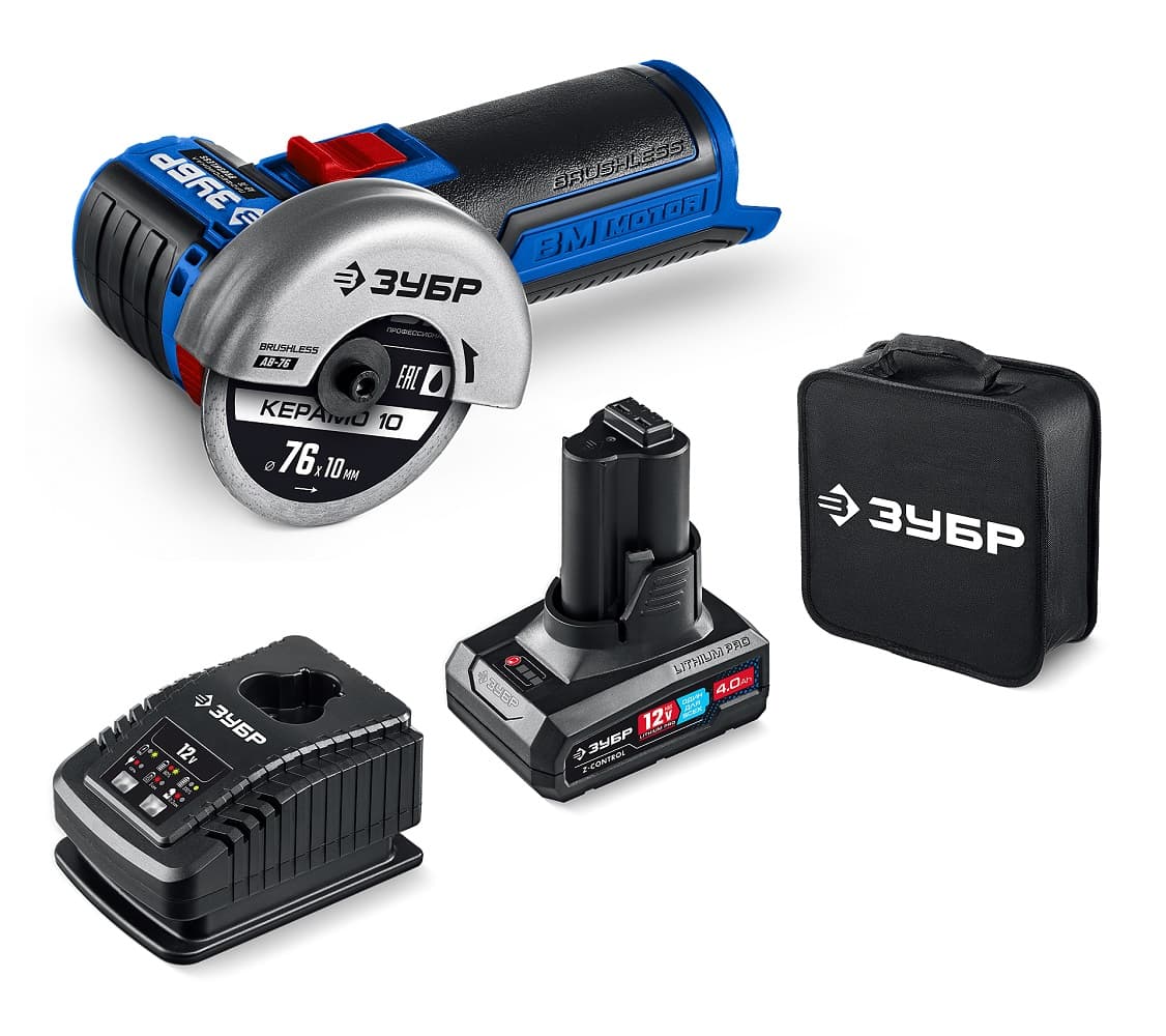 Описание Шлифовальная машина Зубр AB-76-41 Высокотехнологичная замена сетевому инструменту. Маневренная УШМ суперкомпактного класса позволяет выполнять резку одной рукой в самых ограниченных местах. Повышенные надежность и безопасность благодаря всем контрольными и защитными системами. Низкое энергопотребление позволяет работать дольше Применение Для резки металла, пластика, плитки и ламината при установке соответствующих отрезных кругов Преимущества Единая аккумуляторная система 12V MAX LITHIUM PRO для множества инструментов Бесщеточный BM-Motor двигатель Li-Ion Pro батарея для большей эффективности Батарея емкостью 4.0 Ач в комплекте для безостановочной работы Необходимые электронные системы для безопасности и лучшего качества работы Быстрый тормоз вала для сокращения выбега при выключении Плата управления батареи с технологией Z-control Быстрозарядное интеллектуальное устройство Прямой привод диска без потерь на преобразование в редукторе Защитный кожух диска с мгновенной регулировкой положения Легкое включение удобной кнопкой в одно движение Удобная сумка для хранения и переноски