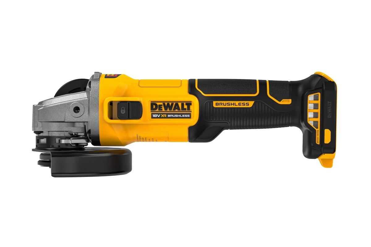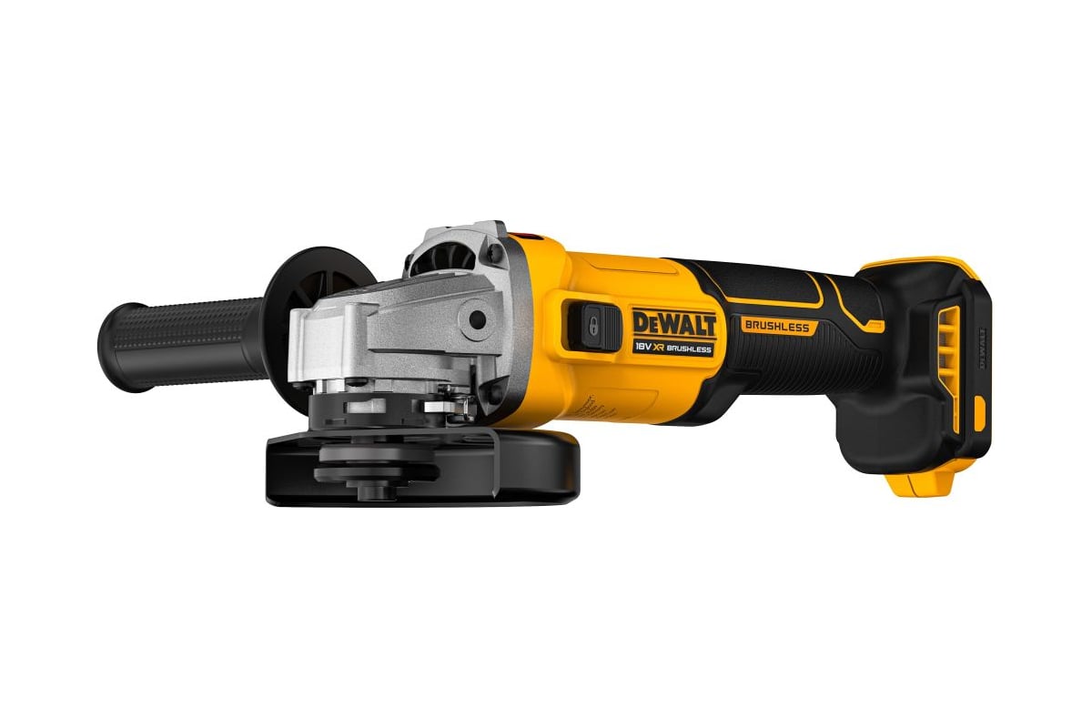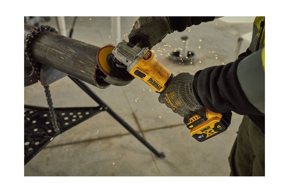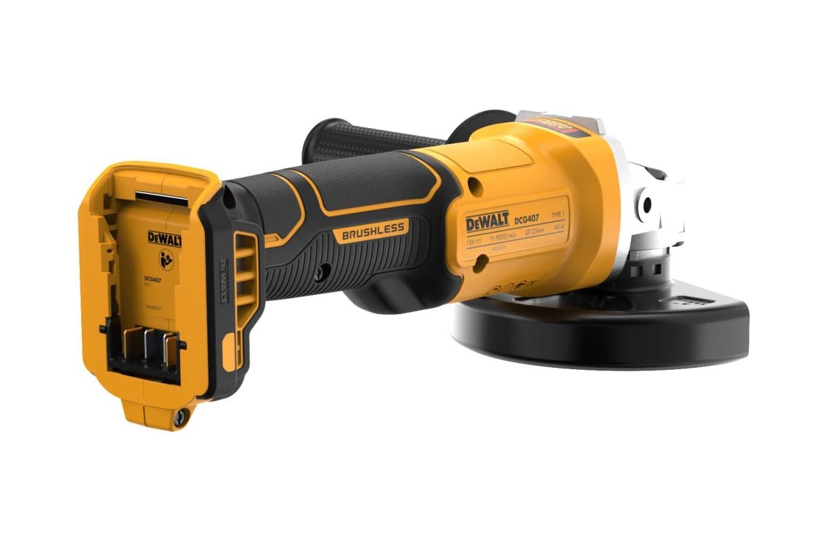 Описание Шлифовальная машина DeWALT DCG407N-XJ Компактная УШМ для обработки металла в сложных условиях (на высоте, в труднодоступных местах). Особенности Бесщёточный двигатель увеличивает время работы на одном цикле заряда до 50% и повышение мощности на 20%. Моментальная остановка диска при выключении инструмента, а также электронная система защиты от обратного удара при заклинивании оснастки. Сетчатый фильтр на вентиляционных отверстиях задерживает частицы пыли. Эргономичный дизайн корпуса, хорошая развесовка, резиновые накладки облегчают контроль инструмента, повышают комфорт во время работы и защищают от повреждений.