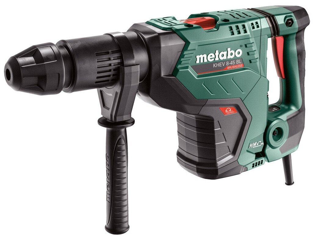 Описание Перфоратор Metabo KHEV 8-45 BL 600766500 Перфоратор Metabo KHEV 8-45 BL предназначается для активного использования во время проведения различных работ по ремонту или строительству. Прибор может работать в 2 режимах: долбления или бурения. В минуту он может осуществлять до 2900 ударов. Безопасность использования обеспечивается возможностью фиксации шпинделя, благодаря которой ни сверло, ни патрон не могут проворачиваться. Продлить срок службы строительного инструмента помогает возможность электронной регулировки частоты вращения или ударов. Перфоратор Metabo KHEV 8-45 BL оснащен мощным двигателем, который на холостом ходу совершает около 300 оборотов. Мощность устройства составляет 1500 Вт. Хвостовик фиксируется в патроне по типу SDS-max. Для сверления бетона максимальный диаметр сверления может достигать 45 мм, а для сверления полых коронок (железобетона, кирпича и т.д.) – 125 мм. Питание осуществляется от сети напряжением 220 В. Предохранительная муфта защищает от обратного удара перфоратора. Более комфортная работа обеспечивается наличием дополнительной рукоятки. Преимущества Metabo KHEV 8-45 BL: Бесщеточный двигатель отличается высокой производительностью и долгим сроком службы; Предохранительная муфта - для защиты инструмента и оператора при заклинивании бура; Дополнительную рукоятку можно выставить в любое удобное оператору положение для надежного хвата; Длинный сетевой кабель - для свободного перемещения по прабочей площадке; Механически разомкнутая рукоятка и гасящая удары контрмасса активно способствуют уменьшению вибрации - нет негативного влияния на здоровье пользователя даже при длительной эксплуатации; Защита от непреднамеренного запуска после прерывания электропитания; Плавный пуск - для работы без рывков; Полноволновая электроника Vario-Tacho-Constamatic (VTC) - для выбора скорости в соответствии с материалом и сохранения ее практически неизменным под нагрузкой; Узкая область захвата эргономичной формы с большим переключателем скорости - для комфортной работы; Опциональное снижение числа оборотов и энергии удара для работы с мягкими материалами; Кейс в комплекте - бережное хранение и удобная транспортировка