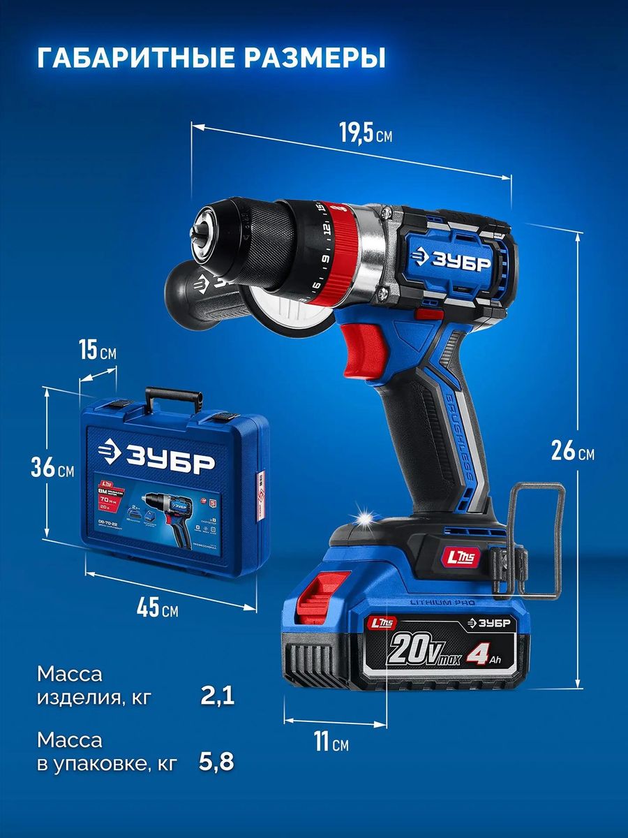 Описание Дрель-шуруповерт Зубр DBS-70-42 ЗУБР Профессионал 20 В, 70 Н·м, 2 АКБ LMS бесщеточная ударная дрель-шуруповерт - высокотехнологичная модель в новой линейке аккумуляторного инструмента ЗУБР серии LMS. Высокий крутящий момент 70 Нм, надежность конструкции и отличная эргономика позволяют выполнять практически любую работу - сверление дерева сверлом Левиса, сверление металла ступенчатым сверлом, заворачивание крепежа диаметром до 12 мм, перемешивание ЛКМ, данная модель также подходит для бурения льда. Преимущества Единая аккумуляторная система LMS для 500+ инструментов Современные аккумуляторы универсальной системы LMS повышенной емкости 20 А*ч позволяет инструменту работать дольше и эффективнее Бесщеточный BM-Motor двигатель обеспечивает ряд преимуществ: высокий крутящий момент, высокий КПД, повышенная надежность Низкое энергопотребление (до 4 раз дольше работа на одном заряде батареи) Компактный корпус при крутящем моменте 70 Нм за счет современных технологий Высокие крутящий момент и надежность благодаря оптимальному подбору параметров пары двигатель-редуктор 8 (2 физических х 4 электронных) скоростей вращения благодаря инновационному режиму ограничения максимальной скорости Обеспечивает возможность старта изделия с микрооборотов для особо ответственных отверстий или аккуратного закручивания Ударная функция расширяет спектр применения изделия и позволяет сверлить отверстия также в легком бетоне Усиленный двухскоростной редуктор с металлическим корпусом для передачи значительного крутящего момента Быстрозажимной одномуфтовый патрон для максимальной простоты и скорости замены расходного инструмента Переднее вращающееся кольцо предотвращает повреждение материала Электронный тормоз двигателя исключает выбег при остановке и ускоряет серийную работу Дополнительная рукоятка для надежного удержания и реализации всего потенциала инструмента Широкий диапазон регулировки крутящего момента с равномерным нарастанием момента во всем диапазоне Подходит для использования в качестве ледобура (при условии сверления на 1й скорости, буром правого вращения не более 100 мм диаметром) Трехрежимная (выключено, включение с инструментом, фонарь) подсветка рабочего места не перекрывается патроном Проволочная скоба крепления на поясе и держатель бит Мягкие накладки на рукоятке повышают удобство хвата