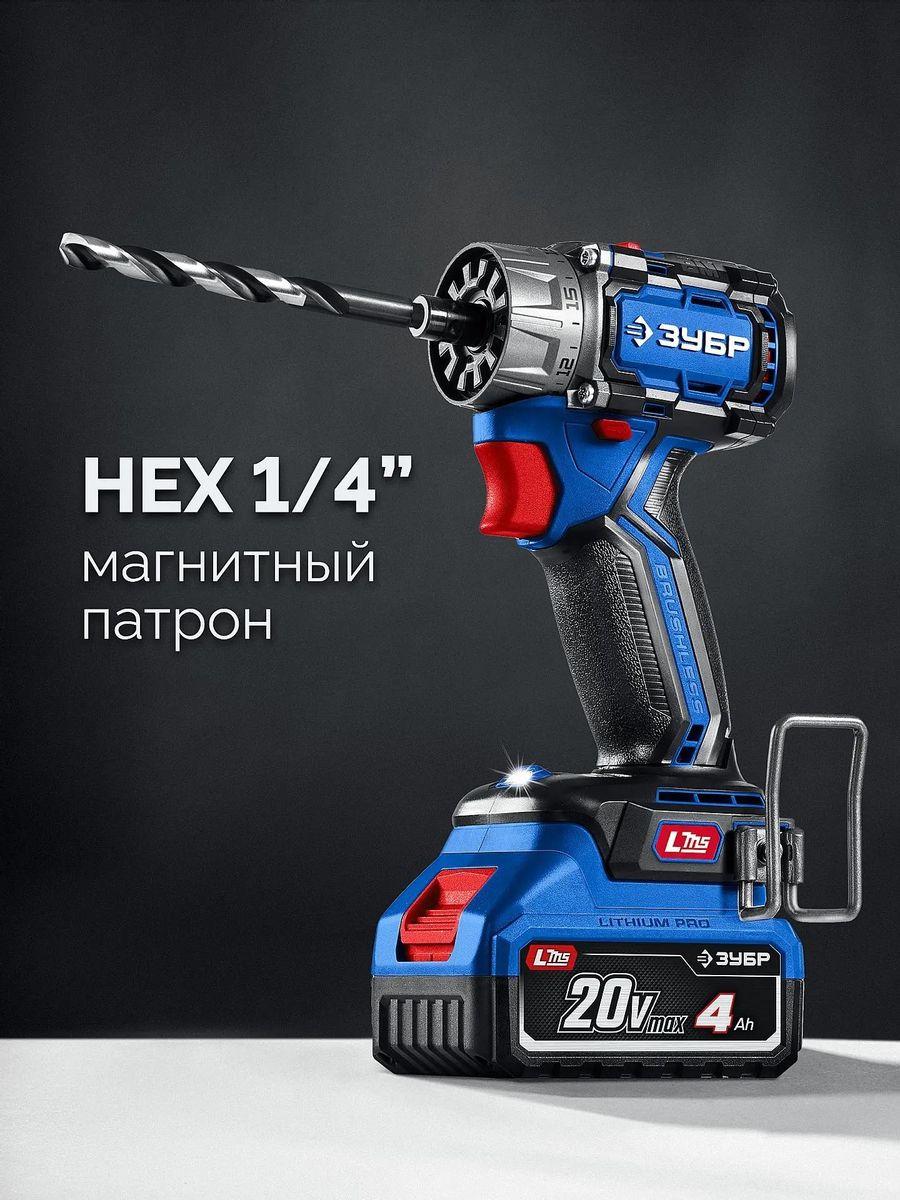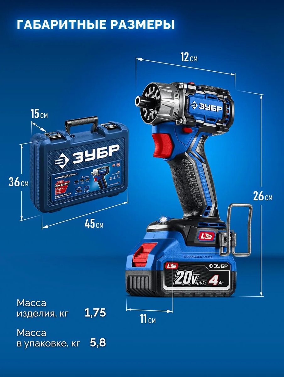Описание Дрель-шуруповерт Зубр DB-50-42-H3 Высокотехнологичная модель в новой линейке аккумуляторного инструмента ЗУБР серии LMS Компактная дрель-шуруповерт профессионального уровня с передовым BRUSHLESS двигателем. Крутящий момент 50 Нм и небольшой вес делают его удобным для наиболее распространенных работ - сверление дерева и металла, заворачивание крепежа диаметром до 8 мм, перемешивание ЛКМ и прочее 3 сменных патрона в комплекте для расширения функциональности Комплектация с двумя емкими аккумуляторами позволяет работать практически без остановки Применение Для сверления отверстий в различных материалах (при установке соответствующих сверл), закручивания/откручивания резьбовых соединений (при установке соответствующих бит),перемешивания ЛКМ (при установке соответствующих насадок) Преимущества: Единая аккумуляторная система LMS для 500+ инструментов Технологичный инструмент для средних работ Современные аккумуляторы универсальной системы LMS повышенной емкости 4.0 А*ч позволяет инструменту работать дольше и эффективнее Бесщеточный двигатель обладает рядом преимуществ по сравнению с щеточным двигателем Компактный корпус и малый вес для удобства при длительной работе и доступа в ограниченные места Достаточный крутящий момент и высокая надежность благодаря оптимальному подбору параметров пары двигатель-редуктор 8 (2 физических х 4 электронных) скоростей вращения благодаря инновационному режиму ограничения максимальной скорости обеспечивают возможность старта изделия с микрооборотов для особо ответственных отверстий или аккуратного закручивания Набор сменных патронов
