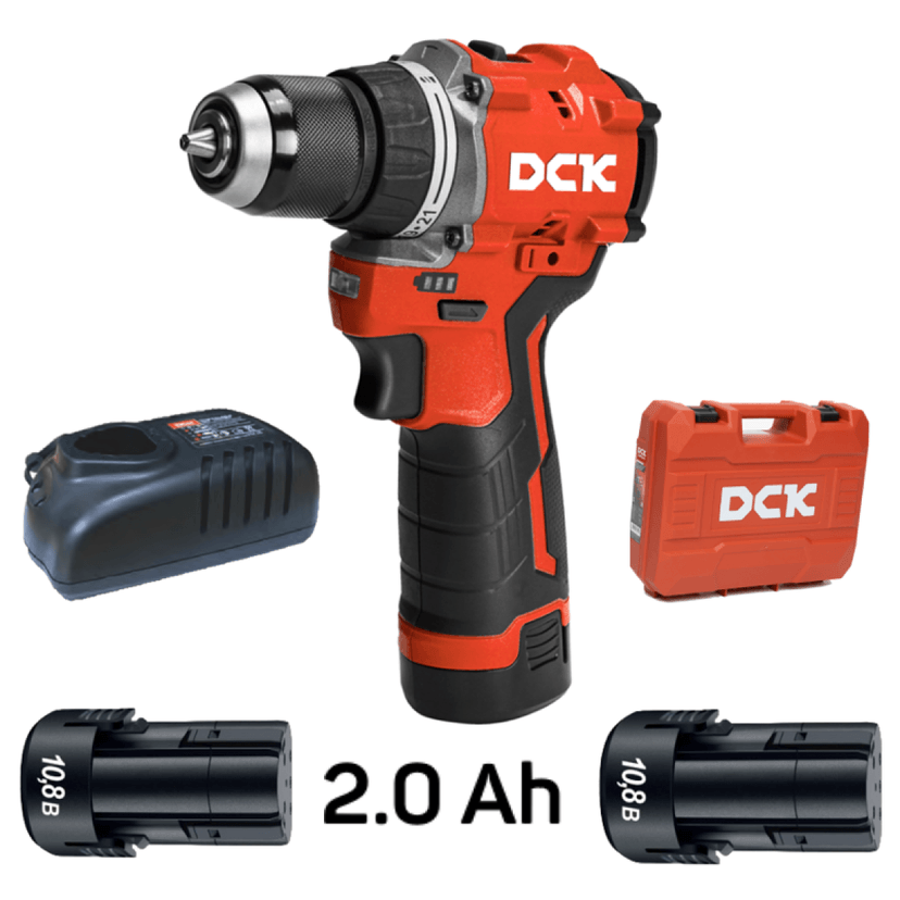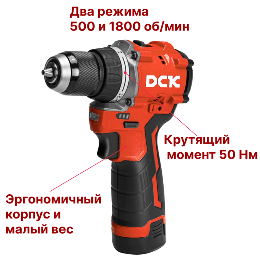 Описание Дрель-шуруповерт DCK KDJZ1250 Аккумуляторная дрель-шуруповерт DCK KDJZ1250 — лёгкий и удобный инструмент для сборки мебели, ремонта, монтажных и отделочных работ. Работает от аккумулятора 10,8 В, оснащена бесщёточным двигателем и двухскоростным редуктором. Крутящий момент до 50 Нм позволяет уверенно работать с деревом, пластиком и металлом. Особенности: Бесщёточный двигатель повышает мощность и срок службы. Крутящий момент 50 Нм подходит для большинства бытовых задач. Две скорости для сверления и заворачивания крепежа. Светодиодная подсветка улучшает видимость рабочей зоны. Эргономичный корпус и малый вес снижают усталость при работе. Ультракомпактный размер позволяет работать в условиях ограниченного пространства. Система защиты аккумулятора от перегрузок. Компактный кейс упрощает хранение и транспортировку.