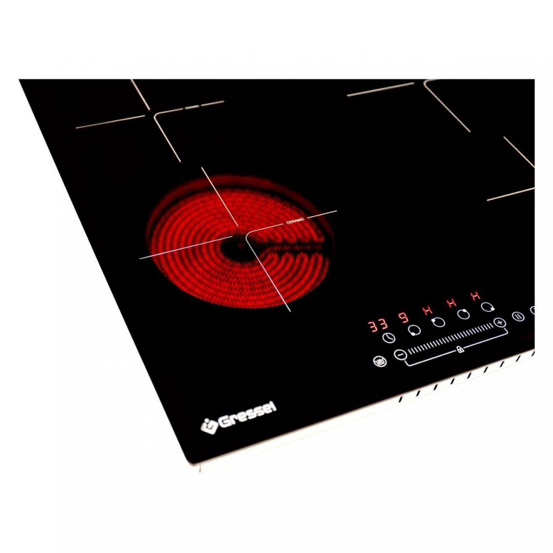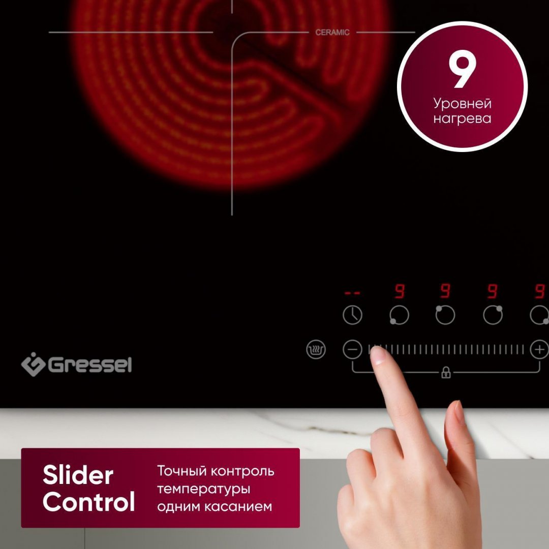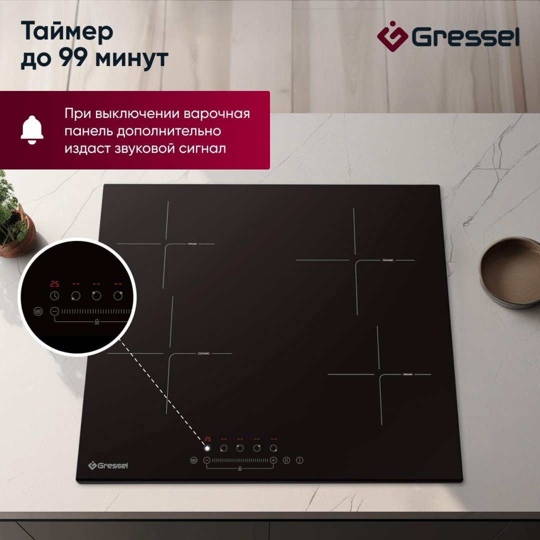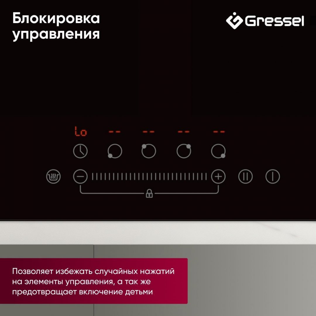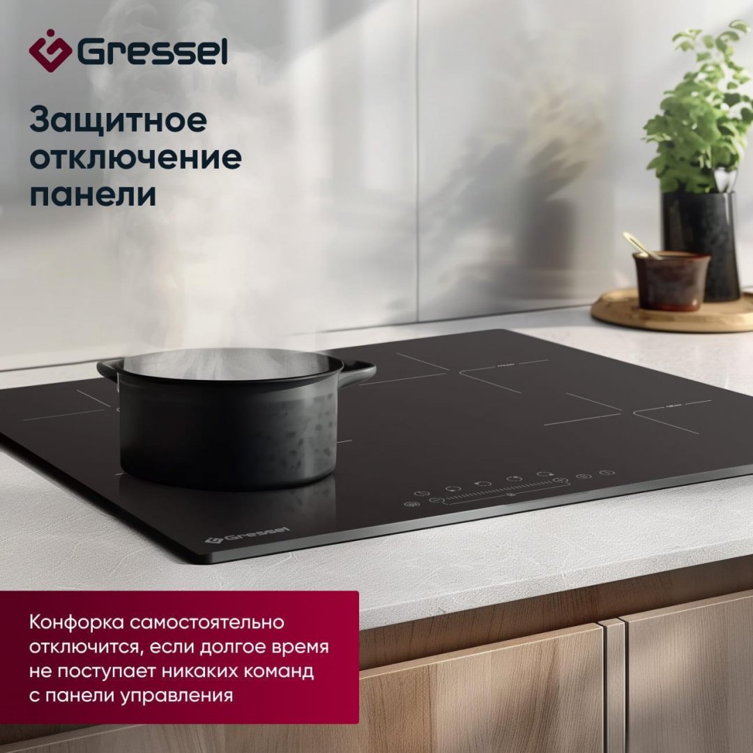Описание Варочная панель электрическая Gressel U60D14S100 Встраиваемая электрическая панель Gressel U60D14S100 выполнена из закаленного стекла без рамки. Компактные размеры 590х520 мм подходят для стандартных ниш шириной 560 мм, обеспечивая аккуратную установку и надежное крепление в столешнице толщиной от 30 мм. Четыре нагревательных зоны типа Hi-Light Конфорки диаметром 16,5 и 20 см подходят для различной посуды. Мощность 1,2 и 1,8 кВт гарантирует равномерное распределение тепла и быстрый разогрев без потерь энергии. Сенсорное управление слайдерного типа Панель расположена спереди и оснащена чувствительными сенсорными зонами, реагирующими на легкое касание. Цифровой дисплей с индикацией режимов Экран отображает выбранные параметры нагрева и состояние конфорок. Встроены индикаторы остаточного тепла, включения и отсутствия посуды. Автоматическое отключение Система безопасности срабатывает при проливе жидкости или перегреве. Управление блокируется для защиты от детей и предотвращения случайного изменения настроек. Режим быстрого нагрева Импульсный принцип ускоряет выход на рабочую температуру, сокращая время приготовления без увеличения энергопотребления. Звуковое уведомление информирует о завершении установленного времени на таймере. Доступна функция самодиагностики неисправностей. Потребляемая мощность составляет 6000 Вт, длина кабеля питания равна 1 м.