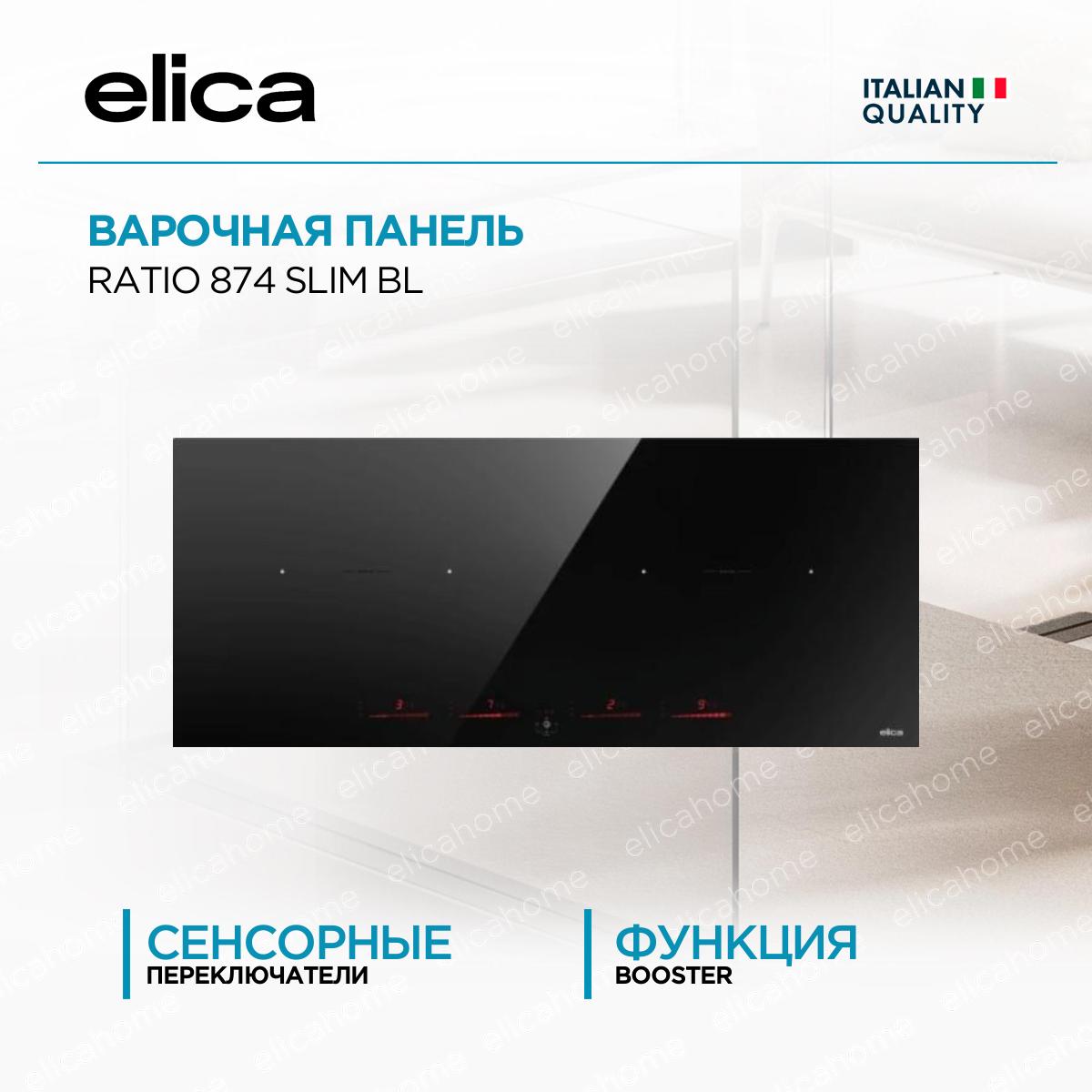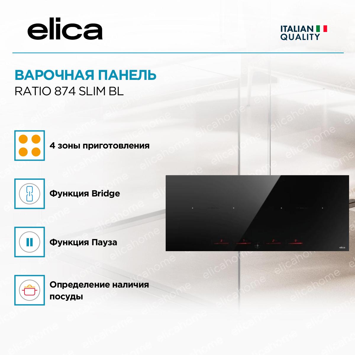 Описание Варочная панель электрическая Elica Ratio 874 Plus [PRF0183917] индукционная Данная варочная панель уникальной формы и с максимальной эргономичностью предназначена для приготовления пищи в кастрюлях и сковородках разного размера. Она оснащена функцией, которая позволяет объединить две варочные зоны (справа или слева), обеспечивая равномерную мощность и температуру даже для самых больших кастрюль. Сенсорное слайдерное управление каждой конфоркой напрямую позволяет легко и быстро настроить все функции. Вы можете использовать: зону для растапливания масла и шоколада без подгорания, зону для медленного приготовления и для поддержания готовых блюд в теплом состоянии, особую для подогрева соусов и кремов, а также зону для кипячения пищи без раздражающего выплескивания воды. Повышенная мощность позволяет довести воду до кипения всего за несколько минут. Нагрев можно регулировать, просто перемещая кастрюлю из одной зоны приготовления в другую, пользуясь предустановленными уровнями мощности (которые активируются всякий раз, когда обнаруживают присутствие кастрюль и сковородок). Child Lock Большая безопасность и комфорт для детей. Данная функция позволяет избежать случайного включения конфорок или вытяжки, даря домочадчам уют и спокойствие. Stop&Go Остановка и запуск простым нажатием кнопки. Вам нужно прекратить на время готовку? Одним жестом вы можете приостановить все активные функции на варочной панели. Просто нажмите кнопку, чтобы перезапустить их в соответствии с предыдущими настройками. Timer Автоматическое выключение варочных зон. Вы устанавливаете нужное время готовки, и начинается обратный отсчет. По окончании работы панель сама автоматически выключит варочную зону и подаст звуковой сигнал. С помощью сенсорного управления вы также можете установить независимые таймеры на несколько зон одновременно. Cooking Flow Управление нагревом одним простым жестом. Вы можете перейти от режима интенсивного кипения к поддержанию блюда в теплом состоянии просто переместив кастрюлю из одной зоны приготовления в другую. Каждая зона самостоятельно активирует заданную мощность, когда обнаруживает присутствие кастрюли.