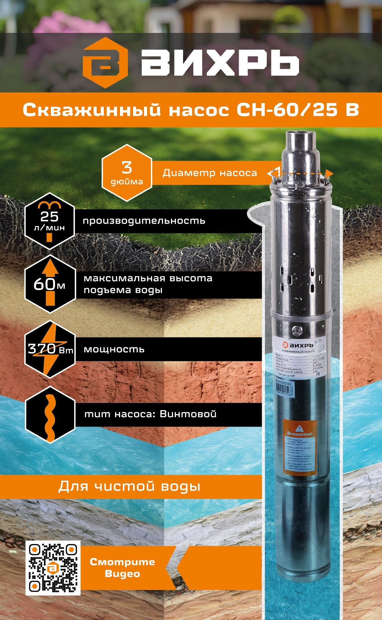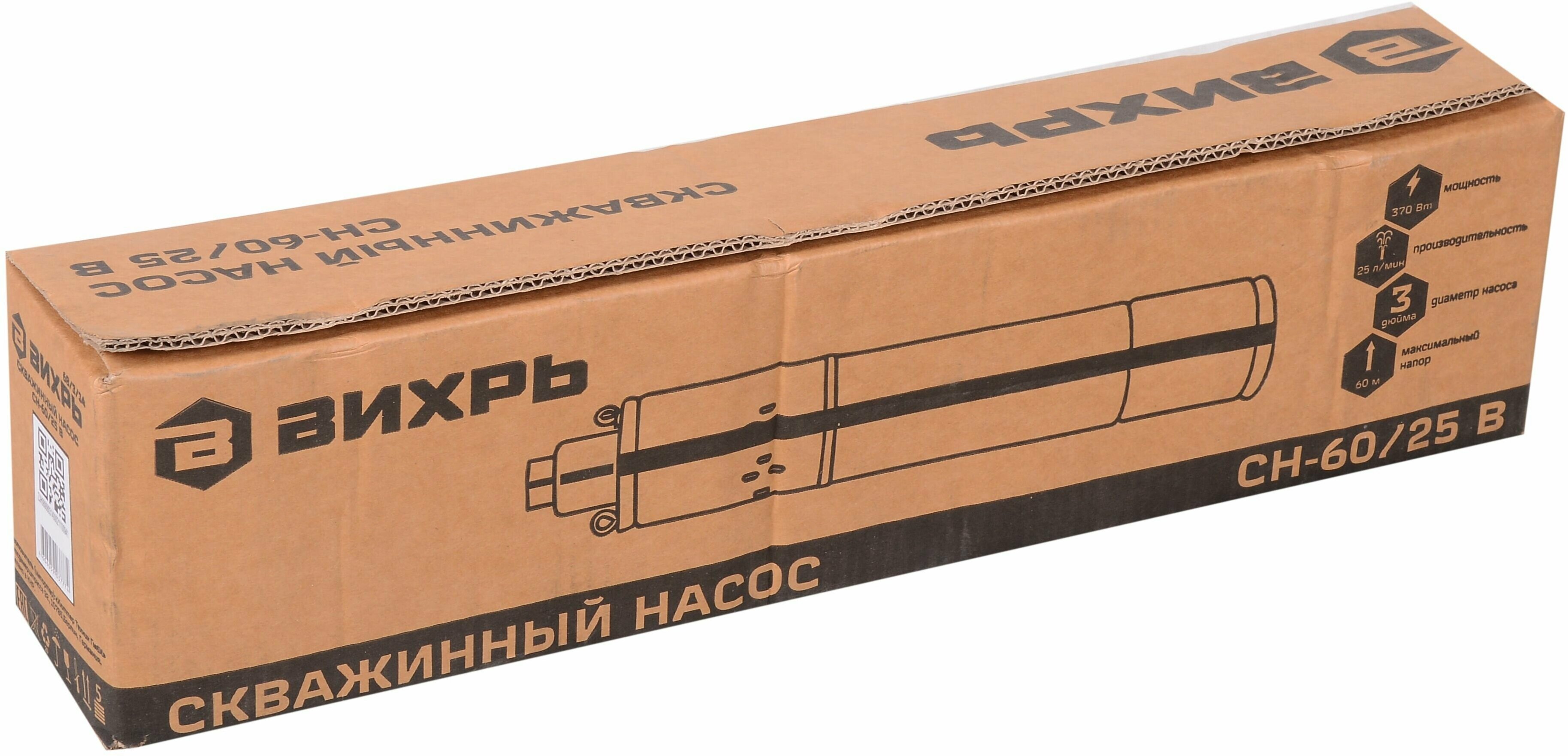 Описание Насос погружной Вихрь СН-60/25 В [68/3/14] Скважинный насос Вихрь СН-60/25 В способен обеспечить стабильную подачу воды из скважин, колодцев, резервуаров и не сильно загрязненных открытых водоемов. Вихрь СН-60/25 В обладает производительностью на уровне 25 л/мин и максимальным напором в пределах 60 метров. Конструкция из нержавеющей стали гарантирует устойчивость к повреждениям и различным воздействиям внешней среды. Диаметр насоса составляет 80 мм. Скважинный насос Вихрь СН-60/25 В подключается к электрической сети и оснащен кабелем длинной 20 метров для удобства в эксплуатации.