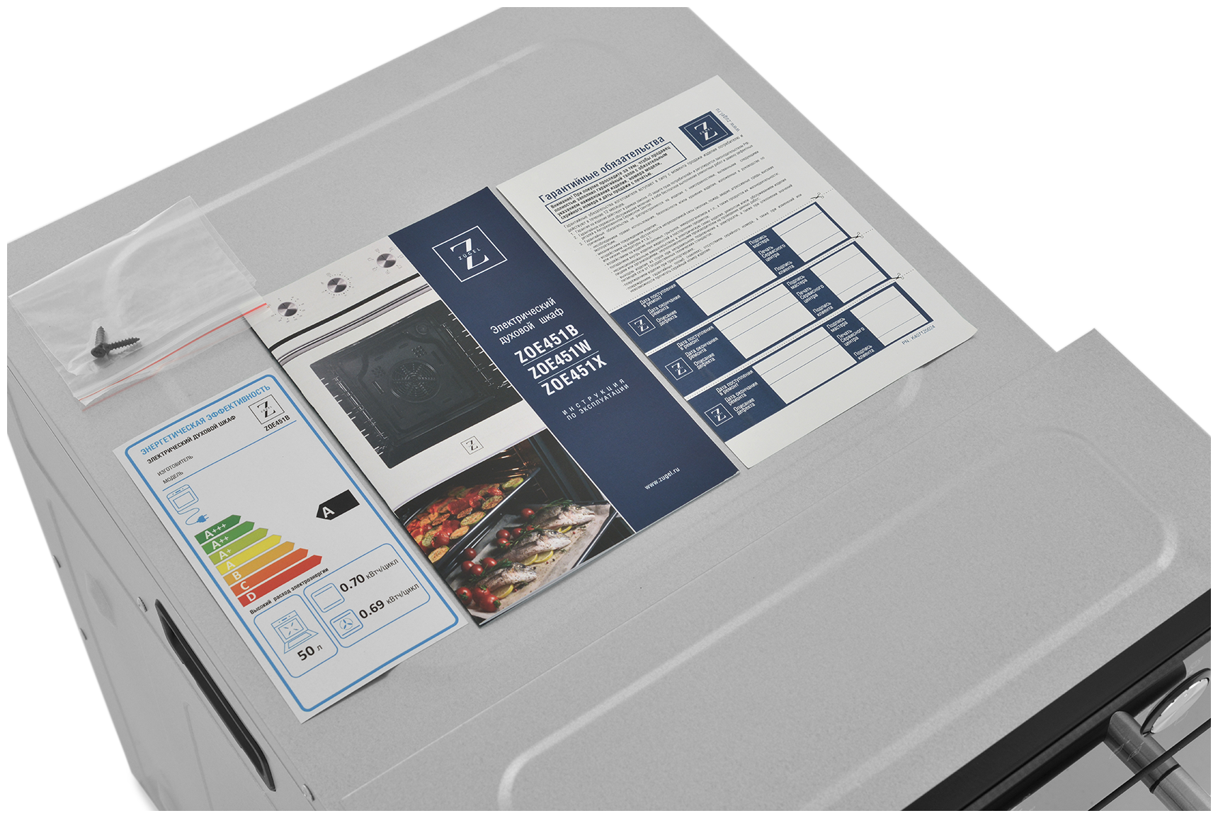 Описание Духовой шкаф ZUGEL ZOE451B Электрический духовой шкаф ZUGEL ZOE451B имеет режим работы «Гриль», что позволяет готовить мясные, рыбные, овощные блюда с сочной мякотью и образованием румяной корочки. Благодаря конвекции обеспечивается равномерное распределение потоков теплого воздуха в пространстве камеры. Это предотвращает пересыхание, подгорание ингредиентов и способствует тщательному пропеканию. С помощью таймера можно установить необходимое время, в течение которого пища будет готовиться. За счет внутреннего освещения удобно контролировать процесс создания блюд. Стенки камеры покрыты качественной эмалью легкой очистки, способствующей эффективному удалению загрязнений с поверхности посредством влажной салфетки или мягкой губки. Утапливаемые переключатели предотвращают случайную активацию устройства, а также упрощают уход за панелью управления. Откидная дверца с трехслойным стеклом оснащена ручкой эргономичной формы, которая обеспечивает удобное открывание. В комплекте с электрическим духовым шкафом ZUGEL ZOE451B есть противень для приготовления блюд и решетка.
