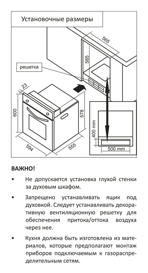 Описание Духовой шкаф MBS DG-607BL Встраиваемый газовый духовой шкаф DG-607BL черного цвета с металлической фурнитурой бронзового цвета прекрасно впишется в интерьер кухни классического стиля, стиля кантри или прованс, а блюда, которые вы сможете приготовить с его помощью для своей семьи, будут радовать вас не только вкусом, но и пользой. Модель MBS DG-607BL может работать в четырех режимах, включая приготовление на вертеле, управление которыми осуществляется удобными ручками. Объем духовки целых 62 литра, а процесс ее очищения происходит посредством гидролизной очистки. MBS DG-607BL комплектуется универсальным противнем, решеткой для гриля и вертелом. При желании вы всегда сможете докупить дополнительный противень, камень для пиццы и комплект телескопических направляющих. Вся кухонная техника бренда MBS соответствует всем современным европейским стандартам, а гарантия производителя составляет 3 года. ВАЖНО: Газовый духовой шкаф устанавливается в пенал кухни с заранее предусмотренной системой вентиляции прибора. Необходимые размеры вентиляционных отверстий указаны в инструкции. Запрещено устанавливать ящик под духовкой. Следует устанавливать декоративную вентиляционную решетку для обеспечения притока/оттока воздуха через нее. Не допускается установка глухой стенки за духовым шкафом. Кухня должна быть изготовлена из материалов, которые предполагают монтаж приборов, подключаемых к газораспределительным сетям, а подключение вправе оказывать только специализированная организация, получившая в установленном порядке допуск к выполнению работ.