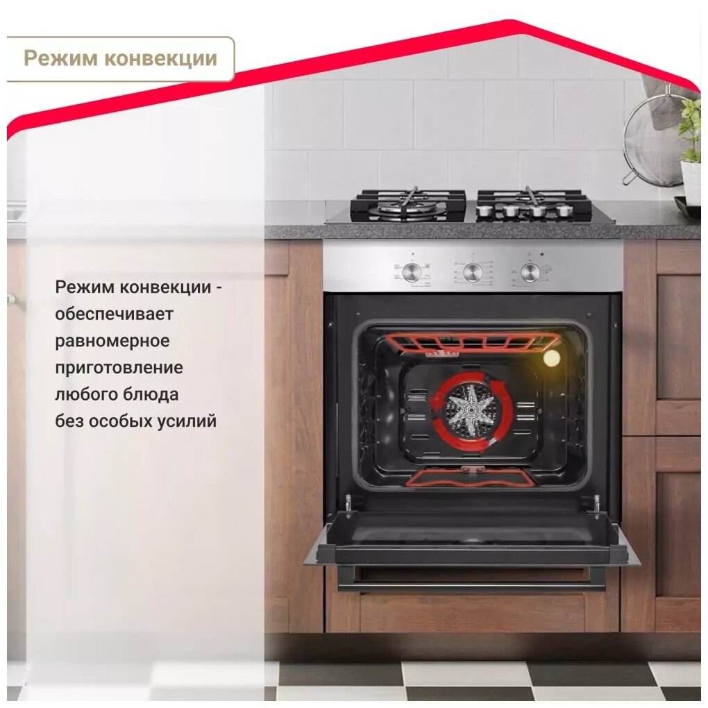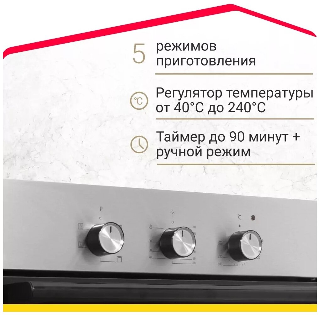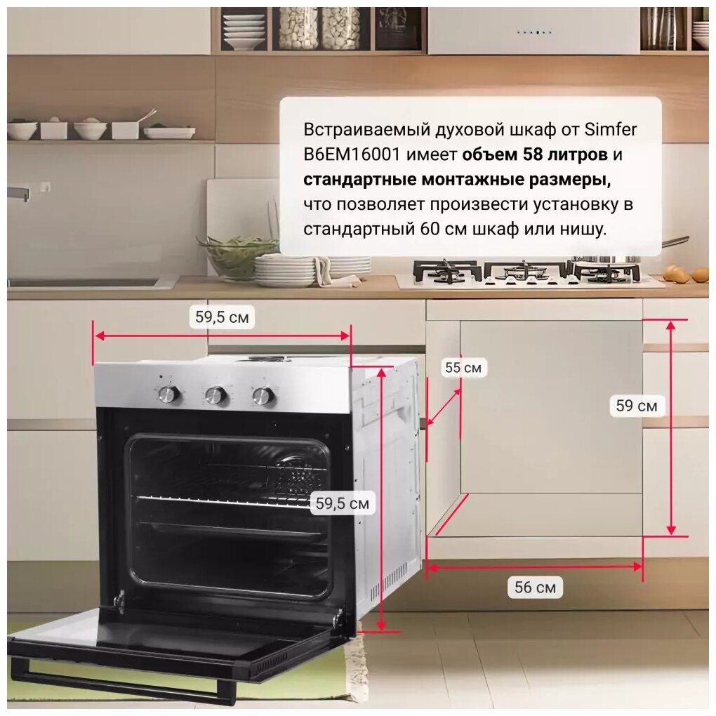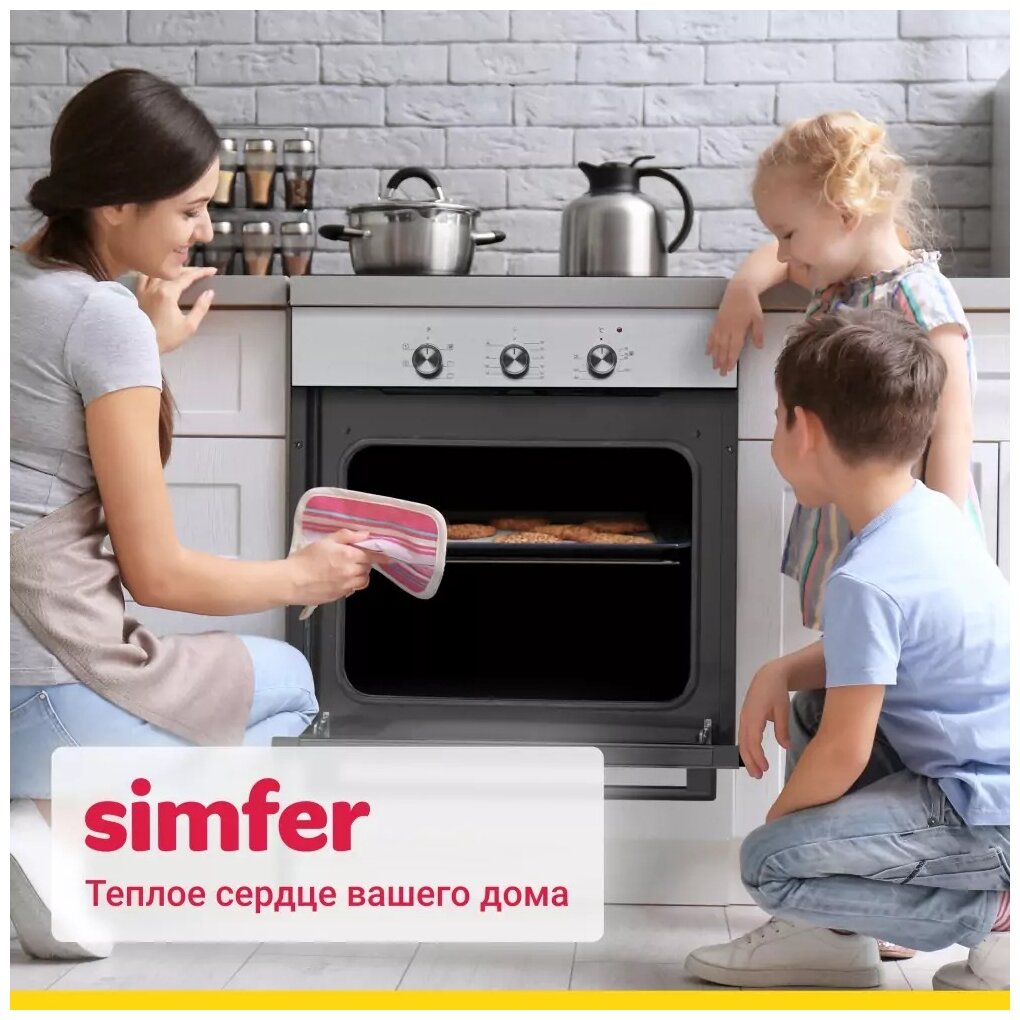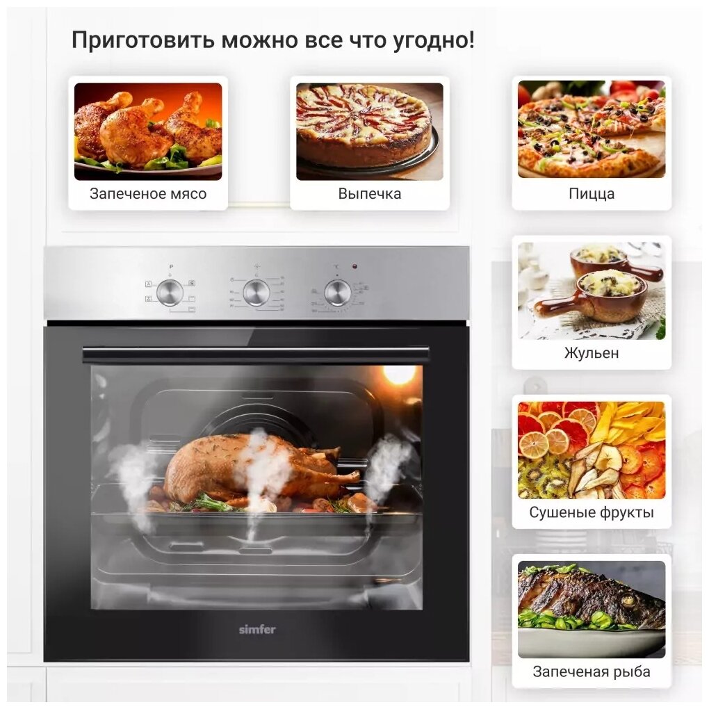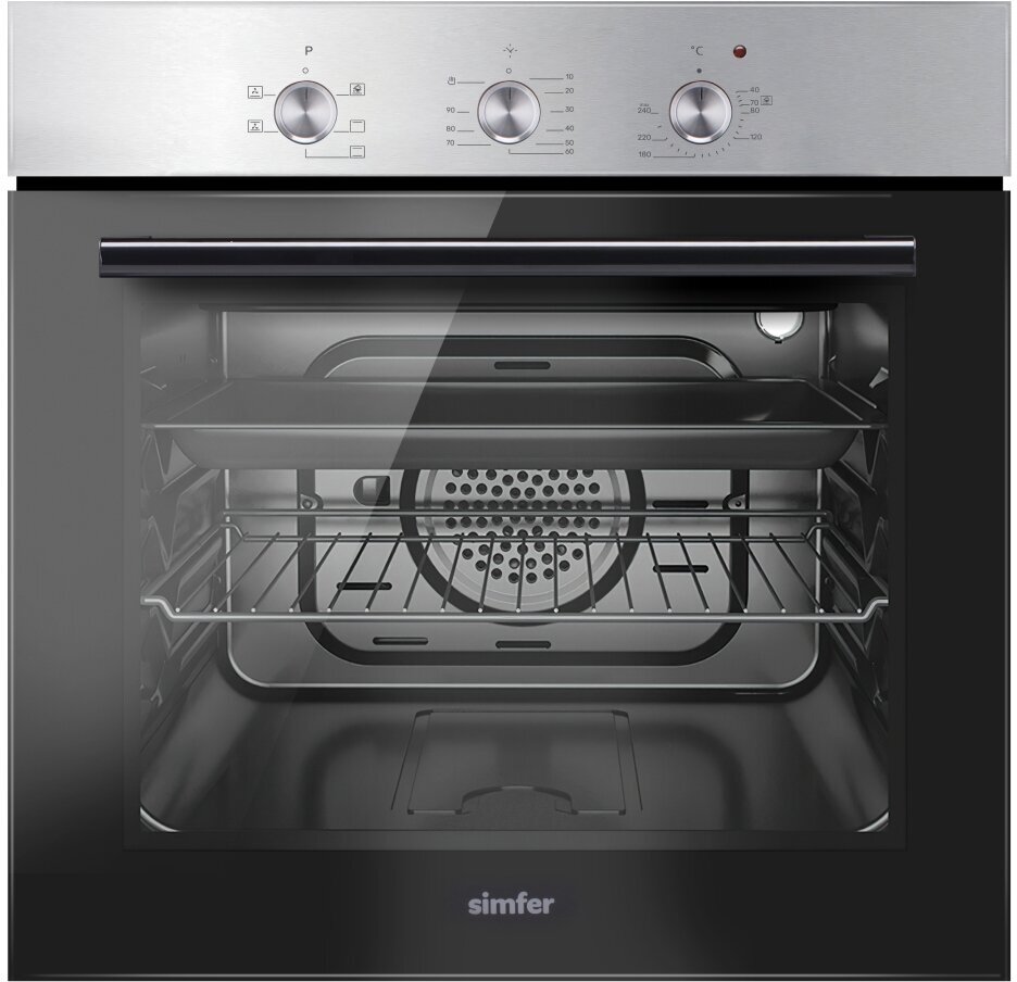 Описание Духовой шкаф Simfer B6EM 16011 Электрический духовой шкаф Simfer B6EM 16011 − мощный и функциональный прибор, представленный в стильном черном корпусе с серебристыми деталями. Внутренний объем прибора составляет 58 л, что позволит вам готовить в нем большие порции блюд. Simfer B6EM 16011 с независимой установкой предусматривает наличие вентилятора охлаждения, что позволит достичь безопасной и долгой эксплуатации устройства. Устройство поддерживает традиционную очистку, что позволяет легко ухаживать за ним. Simfer B6EM16011 поддерживает 6 автоматических программ, среди которых "Конвекция" и "Гриль". В режиме "Конвекция" происходит равномерное прогревание воздуха во всей духовке, что способствует качественному приготовлению пищи. В режиме "Гриль" вы получаете возможность насладиться вкусной корочкой на сочном мясе, приготовить ароматную рыбу или запечь овощи: что бы вы ни готовили, в любом случае вас порадует результат. Духовой шкаф поддерживает защитное отключение. Для управления модель использует поворотные переключатели.